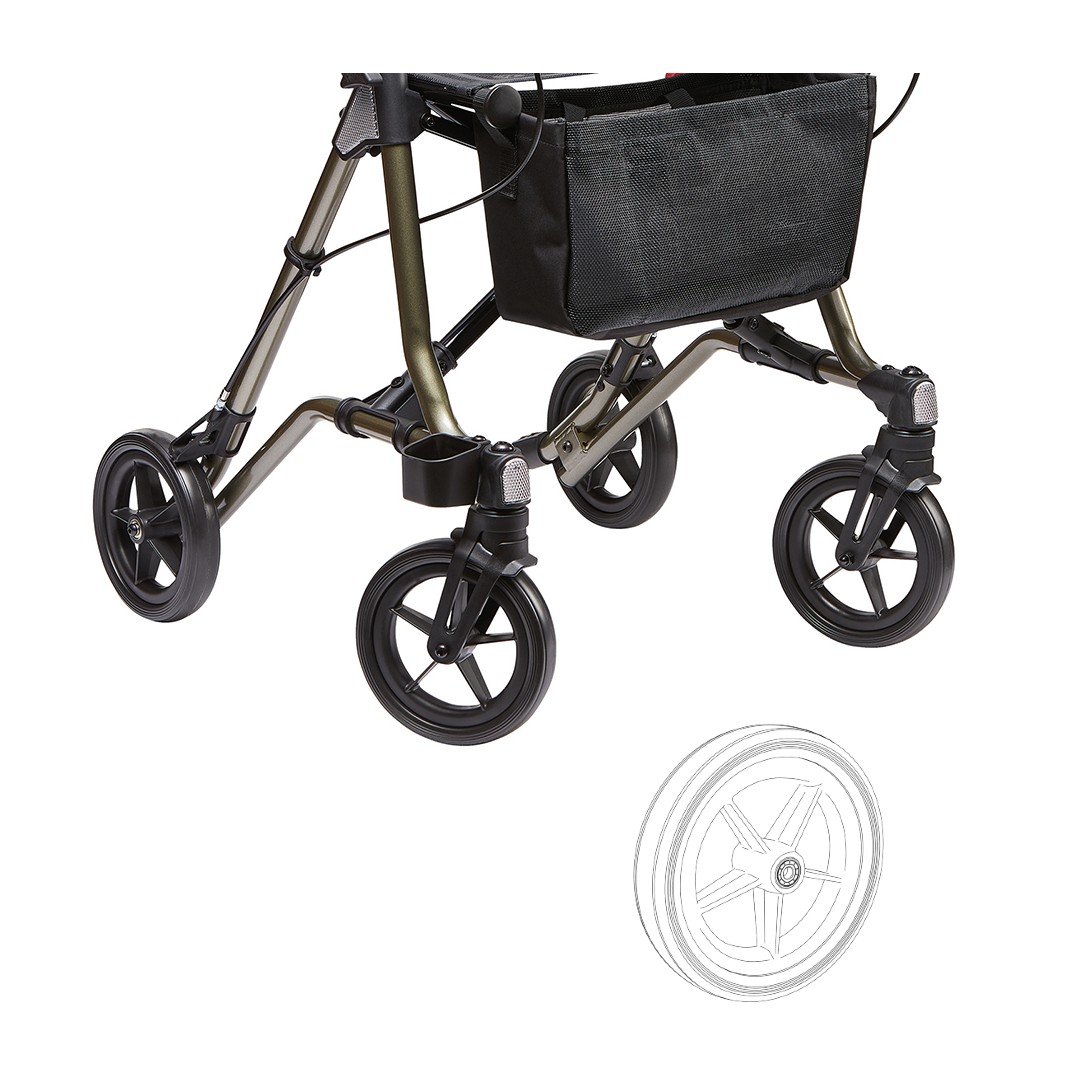Rad für Dietz Taima M GT Dieses hochwertige Ersatzrad ist für den Dietz Taima M GT Rollator. Mit der 8” EVA-Bereifung und dem robusten 5-Speichen-Design gewährleistet es sowohl vorne als auch hinten eine hohe Stabilität und lange Lebensdauer. Die schwarze Bereifung und die komplette Felge sind speziell für Modelle ab Baujahr 2017 konzipiert. Ersetzen Sie abgenutzte oder beschädigte Räder ganz einfach und sorgen Sie für eine sicher Fahrt mit ihrem Rollator. 8” EVA Bereifung, Komplettrad mit Felge, 1 Stück Rad Einsetzbar für vorne oder hinten Bereifung schwarz 5 Speichen ab Baujahr 2017