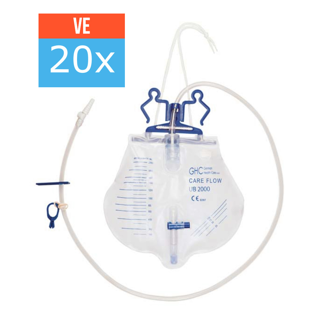 20 Stück GHC Bettbeutel 2000ml – 90cm (unsere MonoFlo Alternative) Der Care Flow UB 2000 Bettbeutel ist ein geschlossenes Urindrainagesystem mit einem Füllvolumen von 2000ml und einer Schlauchlänge von 90cm Der angebrachte Konnektor weist eine spezielle Ausrichtung auf und sorgt so für eine zuverlässige Verbindung zum Katheter. Eine nadelfreie Urinprobeentnahme ist jederzeit am Konnektor möglich und verhindert Nadelstichverletzungen. Das oktogonale Innenprofil des Zuleitungsschlauches gewährleistet eine hohe Stabilität, ist aber dennoch flexibel und garantiert somit in jeder Situation eine sichere Drainage zur Tropfkammer. Die Tropfkammer ist mit einem Rücklaufventil versehen, welches den Rückfluss von Urin zuverlässig verhindert. Die Gefahr von aufsteigenden Infektionen wird somit vorgebeugt. Der Ablasshahn kann diskret am Urinbeutel angebrachten Doghouse untergebracht werden. Eine spezielle Konterwulst am Kolben des Ablasshahns ermöglicht eine sichere Handhabung. Leckagen sind dadurch ausgeschlossen. Bakterien- und flüssigkeitsdichte Belüftungsfilter sorgen für einen permanenten Druckausgleich. Dadurch wird eine optimale Drainage im System erzielt. Der Zwillingshalter mit zusätzlicher Befestigungskordel ermöglicht eine sichere und korrekte Befestigung an den unterschiedlichsten Bettholmen. PZN 09151597 HMV 15.25.07.0050 Der Care Flow UB 2000 Bettbeutel ist ein geschlossenes Urindrainagesystem mit einem Füllvolumen von 2000 ml und einer Schlauchlänge von 90 cm. Der angebrachte Konnektor weist eine spezielle Ausrichtung auf und sorgt so für eine zuverlässige Verbindung zum Katheter. Eine nadelfreie Urinprobeentnahme ist jederzeit am Konnektor möglich und verhindert Nadelstichverletzungen. Das oktogonale Innenprofil des Zuleitungsschlauches gewährleistet eine hohe Stabilität, ist aber dennoch flexibel und garantiert somit in jeder Situation eine sichere Drainage zur Tropfkammer. Die Tropfkammer ist mit einem Rücklaufventil versehen, welches den Rückfluss von Urin zuverlässig verhindert. Die Gefahr von aufsteigenden Infektionen wird somit vorgebeugt. Der Ablasshahn kann diskret am Urinbeutel angebrachten Doghouse untergebracht werden. Eine spezielle Konterwulst am Kolben des Ablasshahns ermöglicht eine sichere Handhabung. Leckagen sind dadurch ausgeschlossen. Bakterien- und flüssigkeitsdichte Belüftungsfilter sorgen für einen permanenten Druckausgleich. Dadurch wird eine optimale Drainage im System erzielt. Der Zwillingshalter mit zusätzlicher Befestigungskordel ermöglicht eine sichere und korrekte Befestigung an den unterschiedlichsten Bettholmen. Bitte beachten Sie vor Gebrauch des GHC Bettbeutel 2000ml – 90cm aufmerksam die Anweisungen des Herstellers. Änderungen vorbehalten. Abbildungen können vom Original abweichen.