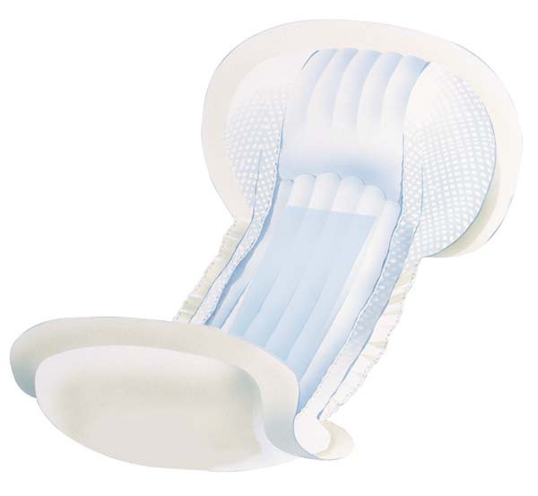 Anatomisch geformte Einlagen mit spezieller Flockenfüllung, zusätzlichem SAP, doppeltem Saugkern, TopDry-Oberfläche, hydrophoben Auslaufsperren, Lycra-Bändern und Klebetape. Die Außenseite der Einlagen besteht aus einer weißen atmungsaktiven Folie. Farbcode: weiß/grün, Saugkraft: 800 ml, Abmessung: 20 x 44 cm, bei leichter bis mittlerer Inkontinenz.