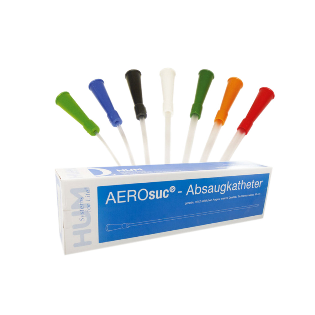 Absaugkatheter aus latexfreiem PVC weich mit 2 seitlichen Augen und zentraler Öffnung steril verpackt im praktischen Aufbewahrungskarton mit 100 Stück Inhalt Länge 50 cm Mit Trichterkonnektor Abgerundete Katheterspitze Jeder Katheter mit Farbcodierung für entsprchende Größe AEROsuc® – Absaugkatheter Absaugkatheter aus latexfreiem PVC, mit weicher medizinischer Schlauchqualität (70 ± 2 Shore A). Länge ca. 50 cm, einzeln steril verpackt. Gute Gleiteigenschaften, zentrale Öffnung und 2 seitliche Augen, die das Festsaugen der Katheterspitze verhindern, atraumatisch abgerundete Katheterspitze für minimale Schleimhautreizungen. Bitte beachten Sie vor Gebrauch des HUM Absaugkatheter aus latexfreiem PVC aufmerksam die Anweisungen des Herstellers. Änderungen vorbehalten. Abbildungen können vom Original abweichen.