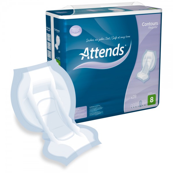 Die Attends Contours Regular 8 (1×28 Stück) ist eine anatomisch geformte Einweg-Einlage, die bei starker Blasenschwäche eingesetzt werden kann. Attends Quick-Dry-Technologie für Hauttrockenheit Große, blaue Auslaufbarrieren (Lock-in-System): seitlicher Auslaufschutz und keine Rückführung von Urin an die Haut  Geruchsbindungsfunktion Odour Protection verhindert unangenehme Gerüche Nässeindikator auf der Rückseite der Einlagen: zeigt optimalen Wechsel-Zeitpunkt an Klebepunkte zum Fixieren im Slip Hautfreundlich Latexfrei Saugstärke: 8 Länge: ca. 65 cm Dicke: ca. 7,1 mm Lieferumfang: 1×28 Stück Attends Contours Regular 8