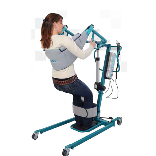 Aufrichtlifter aks mini-dualo aktiv der kleine Aktivlifter für die Stehfunktion Als Aktivlifter dient der aks-mini-dualo ausschließlich zum Aufrichten des Patienten vom Sitzen in den Stand und zum Umsetzen in einem geeigneten aks-Gurt Multifunktionalität: optimale Nutzung der vielseitigen Funktionen eines großen Standard- und/oder eines Aufrichtlifters wie Heben, Umsetzen und Aufrichten von Personen Aufnahme direkt vom Fußboden, Unterstützung bei der Hygiene Er unterstützt den natürlichen Bewegungsablauf des Aufstehens und Hinsetzens und kann mit dem aufgerichteten Patienten verfahren werden, sodass z.B. der selbstständige Toilettengang erhalten bleibt. Nachfolgemodell des erfolgreichen und bekannten Lifter ‘aks mini torneo’ Die Vorteile des Aufrichtlifter aks mini-dualo aktiv hochwertige und langlebige Edelstahl-Vierkantrohre mit Standardlifter können Sie jederzeit den Aufrichtarm des Aktivlifters und das entsprechende Equipment nachrüsten mehr Transparenz und Sicherheit: Steckbolzen mit Drahtseil an der Hebearmaufnahme gegen Verlust gesichert, mechanische Notabsenkung, Notaus-Schalter, optischer und akustischer Warnhinweis gegen Tiefentladung der Akkus bei Betätigung der Handbedienung mit oder ohne Wadengurt erhältlich Der Minilifter erfüllt alle Anforderungen eines großen, ist nur aufgrund seiner geringeren Ausmaße wendiger und handlicher. ca. 40 Hebe- und Senkvorgänge bei einer Akkukapazität zusammenklappbar und transportabel Wirtschaftlichkeit und Effektivität: geringere Anschaffungskosten und hohe Nutzungsfrequenz, bedarfsorientierter Einsatz als dualer Lifter – besonders in Pflegeeinrichtungen sinnvoll hohe Standfestigkeit durch mechanische Spreizung des Fahrgestells per Fußhebel und stabile Konstruktion, zwei feststellbare Rollen (Durchmesser 100 mm) Anwendung Zur Anwendung des Aktivlifters ist ein aktives Mithelfen des Patienten erforderlich. Dazu zählt besonders seine Fähigkeit sich am Hebearm festzuhalten. Auch wird durch die Mithilfe des Patienten seine noch verbleibende Restmobilität gefördert, indem der Kreislauf und die Muskulatur gestärkt werden. Deshalb können fehlende Extremitäten oder Funktionseinschränkungen des Bewegungsapparates (z.B. Querschnittslähmung) die Anwendung des Aktivlifters einschränken oder ausschließen. Dies muss durch den Anwender im Einzelfall entschieden werden. Zubehör Bitte lesen Sie vor Gebrauch dieses Aufrichtlifter aks mini-dualo aktiv mit Gurt aufmerksam die Bedienungsanleitung und halten Sie sich an die Anweisungen des Herstellers. Änderungen vorbehalten. Abbildungen können vom Original abweichen.