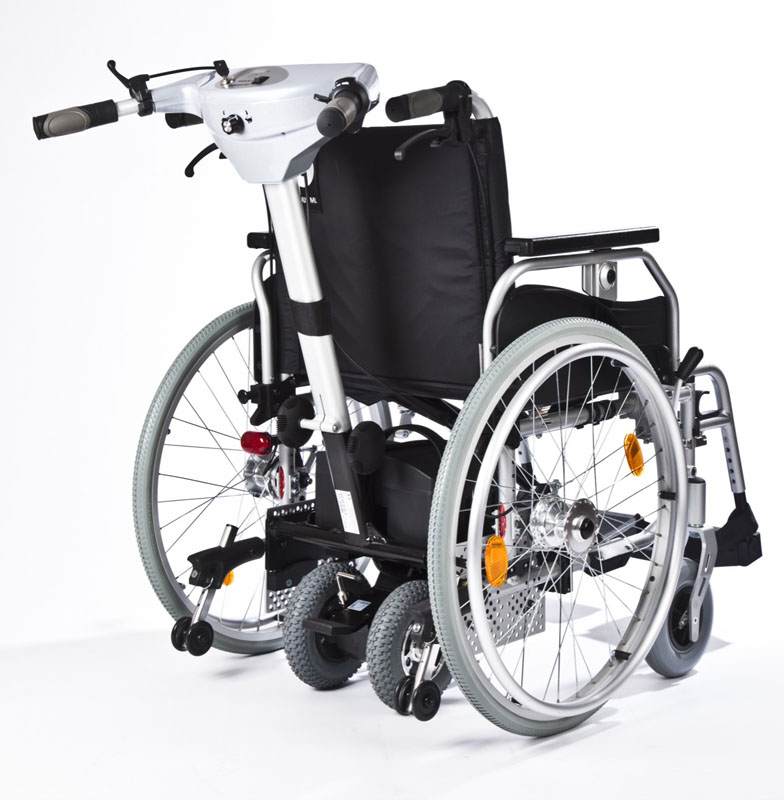 Mobilo EL II elektrische Schiebe- und Bremshilfe im Set mit Rollstuhl Primus MS komplett fertig vormontiert und fahrbereit so einfach war schieben des Rollstuhl noch nie Vorwärtsgeschwindigkeit bis 6 km/h Rückwärtsgeschwindigkeit bis 3 km/h Reichweite ca. 12 km pannensicher bereift aktive LED Beleuchtung inkl. Akku und Ladegerät inkl. Faltrollstuhl inkl. Halterung inkl. Anti-Kipprollen Die Vorteile des Mobilo EL-II Schiebehilfe Tausendfach im täglichen Einsatz beweist der Mobilo seine Zuverlässigkeit. Mobilo EL II ist sowohl der ideale Helfer für die ebene Strecke, als auch der Schieber für bergauf und der Bremser für bergab. Sein robuster akkubetriebener Motor bewältigt mit einer stufenlos regulierbaren Vorwärtsgeschwindigkeit von bis zu 6 km/h sowie einer Rückwärtsgeschwindigkeit von bis zu 3 km/h ebene Strecken bis 12 km mit Patienten von durchschnittlichem Körpergewicht. Steigungen und Gefälle von 10° sind ohne Kraftaufwand für die Begleitung möglich. Der Drehschalter für die Geschwindigkeitsvoreinstellung befindet sich auf der Rückseite des Bedienpults. Der kraftvolle Motor wird durch 2 wartungsfreie handelsübliche Akkus angetrieben, die durch regelmäßiges Aufladen ihre lange Lebensdauer erhalten. Der Ladezustand wird durch farbige Leuchten im Bedienteil angezeigt. Dabei kann die Aufladung durch das mitgelieferte Ladegerät an der Aufladebuchse des Akku-Packs selbst vorgenommen werden. Dies hat für Sie als Nutzer den Vorteil, dass zum Aufladen lediglich der herausnehmbare nur ca. 9,5 kg schwere Akku-Pack nötig ist, der Antrieb selbst kann unabhängig z.B. im Treppenhaus möglichst in abgeschlossenem Zustand verbleiben. Entsprechende Schlüssel sind beigefügt. Der Mobilo EL II ist auf die Körpergröße der Begleitperson anpassbar. Zugleich kann er zum Transport im Kofferraum in 3 Teile zerlegt leicht verstaut werden. Was diesen Antrieb insbesondere auszeichnet, ist seine leichte Handhabung für Patient und Begleitperson. Nach der Montage der Adapterplatten am Rollstuhl durch den autorisierten Fachhandel wird Mobilo EL II angedockt und verriegelt. Das variable Halterungssystem ermöglicht die Kombination mit den meisten gängigen Rollstühlen. Die Vorteile des Primus MS Rollstuhl Als perfekten Einstieg in unser Rollstuhl Kernprogramm stellt sich der Standardstahl Rollstuhl Primus MS mit seinem reichhaltigen Zubehör dar. Wichtigstes Merkmal ist seine Qualität und Robustheit. Für die derzeitige und künftige Grundversorgung erfüllt dieser zeitgemäße Rollstuhl die geforderten Voraussetzungen der Leistungsträger. So bietet der Primus MS beispielsweise nach außen und innen abschwenkbare Beinstützen mit hochklappbaren und mit Fersenbändern versehenen Fußplatten. Die beiden robusten Seitenteile sind zurückklappbar. Ebenso gehören die Steckachsen der 24 Antriebsräder zur Serienausstattung dieses Modells. Zusätzlich zu den werkseitig montierten 175 x 32 mm Lenkrädern bieten wir weitere Größen und Ausführungen an Lenkrädern an. Die Bereifung der Antriebs- und Lenkräder dieses Rollstuhls ist pannensicher. Mit einer Sitzhöhe von 47 bis 53 cm durch die 5-fache Einstellmöglichkeit der Antriebsräder und der Auswahl diverser Lenkräder und Gabeln, einer Sitztiefe von 42 cm, sowie einer Rückenlehnenhöhe von 42 cm ist der Primus MS ein Spezialist in seiner Klasse. Er ist lieferbar in 7 Sitzbreiten von 38 bis 52 cm. Die maximale Belastung des Rollstuhls beträgt 130 kg bei einem Gewicht von ca. 19,0 kg (SB 38) bzw. ca. 19,6 kg (SB 52) in Ausführung ohne Trommelbremsen, jedoch mit Beinstützen und Antriebsrädern. Die Ausführung mit Trommelbremsen hat ein Gewicht von ca. 20,2 kg (SB 38) bzw ca. 20,9 kg (SB 52). Die Grundausstattung des Primus MS wird ergänzt durch ein ausgewähltes Zubehörangebot, mit dem weitere Anwendungsmöglichkeiten gewährleistet sind. Mobilo EL II Schiebehilfe Primus MS Rollstuhl (faltbar) Komplett fertig vormontiert geprüft fahrbereit Bitte lesen Sie vor Gebrauch dieser Schiebe- und Bremshilfe Mobilo EL II aufmerksam die Bedienungsanleitung und halten Sie sich an die Anweisungen des Herstellers. Änderungen vorbehalten. Abbildungen können vom Original abweichen.