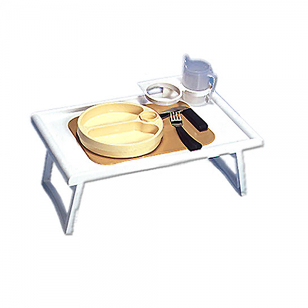 Der zusammenklappbare Bett-Tisch ist aus schlagfestem Kunststoff (Polystyrol). Die weiße Tischplatte hat eine Halterung für Gläser und kleine Flaschen. Die beiden weißen seitlichen Ständer sind fest einrastbar. Maße: 53 x 32 x 20 cm Farbe: weiß