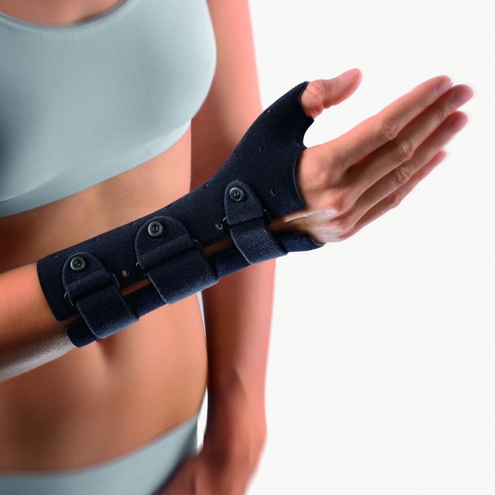 BORT Daumen-Handorthese PRODUKTMERKMALE Handgelenkorthese zur sicheren Immobilisierung von Hand-, Daumengrund- und Daumensattelgelenk Ulnarseitige Orthesenlängen: small: 19 cm, medium:22 cm, large: 26 cm Thermoplastisches Material Innenseite vollflächig mit weichem Schaum kaschiert Perforation Unterziehstrumpf, schwarz DAS MED-PLUS Komplett zu öffnen Angenehmer Tragekomfort Einfache Anformung bei 90 °C (Warmluft) Abwaschbar, wasserfest Indikationen Präoperativ, postoperativ, posttraumatisch, z. B. Karpaltunnelsyndrom (CTS),stabile Kahnbeinfraktur, stabile Radiusfraktur, ulnare Bandläsion (Skidaumen),Tendopathie, Kapselzerrungen