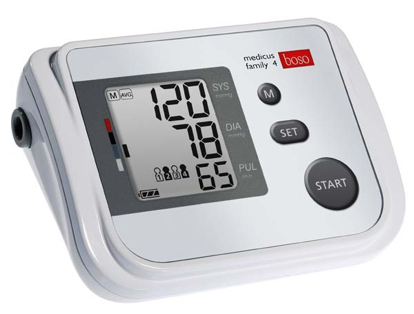 boso medicus family 4 Das Familien-Oberarm-Blutdruckmessgerät Dieses Modell vereint 4 Geräte in einem: 4 getrennte Speicher für je 60 Messungen ermöglichen der ganzen Familie eine optimale Kontrolle des Blutdrucks. Dazu ist das Gerät auch mit einer Universalmanschette für Armumfänge 22 bis 42 cm ausgestattet. Wie bei boso Oberarmgeräten üblich erfolgt die Messung intelligent und ohne Nachpumpen, was gerade bei verschiedenen Nutzern individuell eine sanfte und schnelle Messung ermöglicht. Vollautomatisches Blutdruckmessgerät Messung am Oberarm. Arrhythmie-Erkennung – zeigt Herzrhythmusstörungen und deren Häufigkeit an. Intelligente Aufpumpautomatik für eine Messung ohne Nachpumpen. Bewegungssensor verhindert falsche Messergebnisse. Großes Display mit 3-Werte-Anzeige. 4 Speicher für jeweils 60 Messwerte für Langzeitprofil – mit Datum und Uhrzeit. Gastmodus für weitere Benutzer, deren Werte nicht gespeichert werden sollen. Bewertungsskala nach WHO. Mit Universal-Manschette für Armumfang 22 – 42 cm. Mit Etui, Batterien und Blutdruckpass. Die Vorteile des Boso Medicus Family 4 Dieses Modell vereint 4 Geräte in einem: 4 getrennte Speicher für je 60 Messungen ermöglichen der ganzen Familie eine optimale Kontrolle des Blutdrucks. Dazu ist das Gerät auch mit einer Universalmanschette für Armumfänge 22 bis 42 cm ausgestattet. Wie bei boso Oberarmgeräten üblich, erfolgt die Messung intelligent und ohne Nachpumpen, was gerade bei verschiedenen Nutzern individuell eine sanfte und schnelle Messung ermöglicht. Bitte lesen Sie vor Gebrauch dieses Boso Oberarmblutdruckmessgerät Medicus Family 4 aufmerksam die Bedienungsanleitung und halten Sie sich an die Anweisungen des Herstellers. Änderungen vorbehalten. Abbildungen können vom Original abweichen.