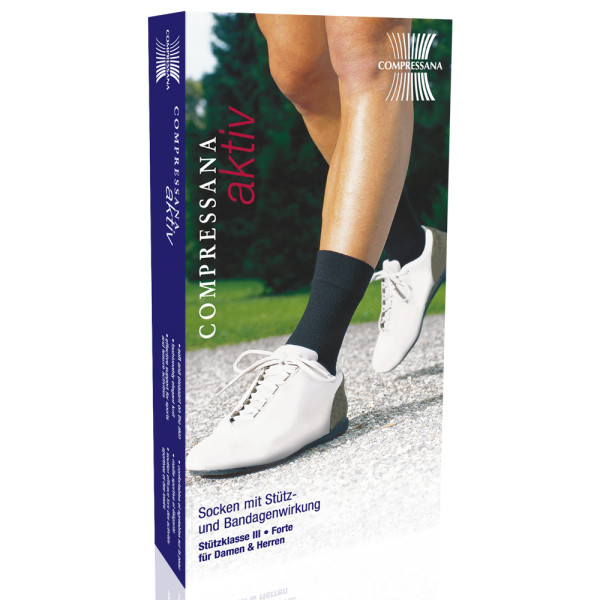 COMPRESSANA AKTIV ist die körpergerechte, anatomisch gestrickte Bandagensocke aus Baumwolle im TWIST Programm. Als kurze, sportliche Socke stabilisiert und entlastet AKTIV das Sprunggelenk und die Sehnen und verhindert Schwellungen. Ein weiteres Plus: AKTIV trägt sich auch im Alltag einfach toll, weil der hohe Druck ein festes, sicheres Standgefühl vermittelt. Der hautsympathische hohe Baumwollanteil garantiert Feuchtigkeitsableitung für trockenen und sportlichen Tragekomfort.Produktinformation:Stütz- und Bandagenwirkung für Fuß, Sprunggelenk und Fesselbereichsorgt für angenehmen Haltkann Schwellungen verhindern und Schmerzen lindernfür Arbeit, Sport und Freizeitweich und angenehm auf der HautIII forte 18mmHg (sehr hoher Druck auf Fesseln)Farbe:schwarznachtblauweißMaterialzusammensetzung:58% Baumwolle26% Polyamid16% ElasthanGröße:I : 36 – 38II : 38 – 40III: 40 – 42IV: 42 – 44V: 44 – 46Lieferumfang:1 Paar