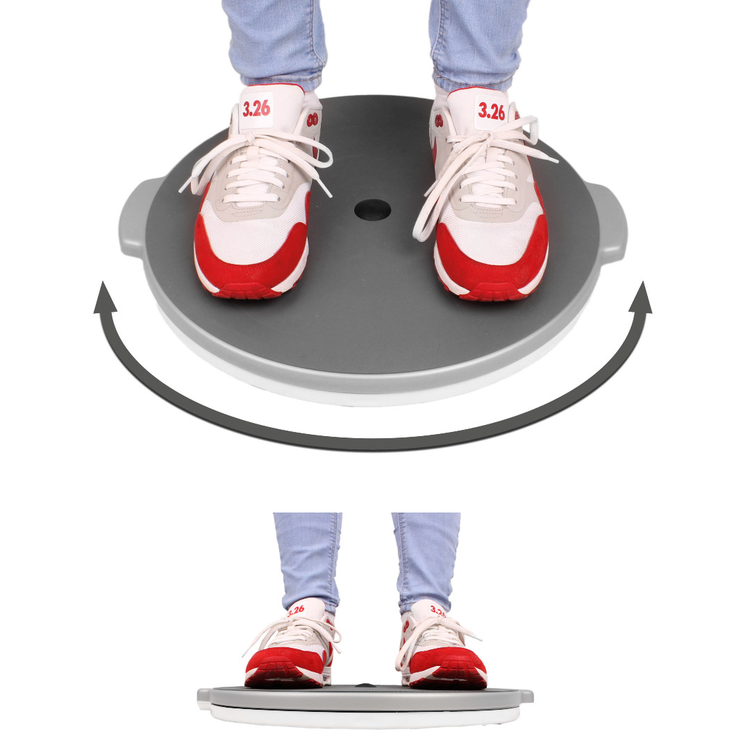 Drehteller EasyTRANSFER Erleichtert das Umsetzen von Personen z.B. vom Rollstuhl ins Bett oder Auto. Eigenständige Nutzung ohne Fremdhilfe ist auch möglich. Mit Griffen für ein einfaches Aufheben, kombinierbar mit unserem Rutschbrett. Der Drehteller Rolko EasyTransfer wird als Transferhilfe für Personen mit Bewegungs- und Funktionseinschränkungen des Beckengürtels in der Pflege eingesetzt. Er dient zur kontrollierten Umlagerung im Stehen mit Unterstützung eines Helfers. Es wird vorausgesetzt, dass der Patient sein eigenes Gewicht mit den Beinen weitestgehend tragen kann. Beispiel Transfer vom Bett zum Rollstuhl Die Nutzung des Drehtellers ist auch für andere Positionswechsel sinnvoll, wie z.B. zur Toilette. Fahren Sie den Rollstuhl so nah wie möglich ans Bett, um die zu überbrückende Distanz möglichst kurz zu halten. Sichern Sie den Rollstuhl gegen Wegrollen. Platzieren Sie den Drehteller auf dem Fußboden direkt vor dem Nutzer, so dass er passend zwischen Bett und Rollstuhl liegt (Bild A). Die rutschfeste graue Beschichtung zeigt nach oben. Der Helfer sichert den Drehteller gegen unerwünschtes Drehen, indem er einen Fuß auf den Teller setzt. Dabei wird die Ferse auf den Fußboden gesetzt, während der Fußballen auf dem Drehteller steht. Die Füße des Nutzers werden mittig auf den Drehteller gestellt (Bild B). Heben Sie die pflegebedürftige Person vom Sitzen in den Stand. Der Nutzer muss dabei sein Gewicht selbst tragen und sicher (mit oder ohne Unterstützung) im Gleichgewicht stehen. Nun kann der Nutzer stehend mit Hilfe des Drehtellers gedreht werden, währenddessen kann der Helfer die Drehbewegung mit einem Fuß auf dem Drehteller steuern (Bild C). Ist die ideale Position vor dem Rollstuhl erreicht, kann der Nutzer langsam in den Rollstuhl gesetzt werden (Bild D). Original ROLKO Drehteller der EasyTRANSFER-Serie