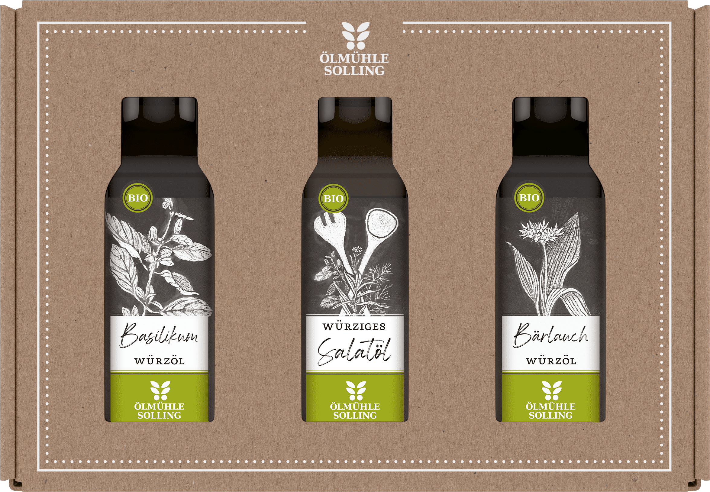 Dieses Set enthält je 100 ml Würzöle: Basilikum, Würziges Salatöl und Bärlauch in der 100 ml Flasche. Zum Würzen und Abschmecken von kalten und warmen Gerichten.