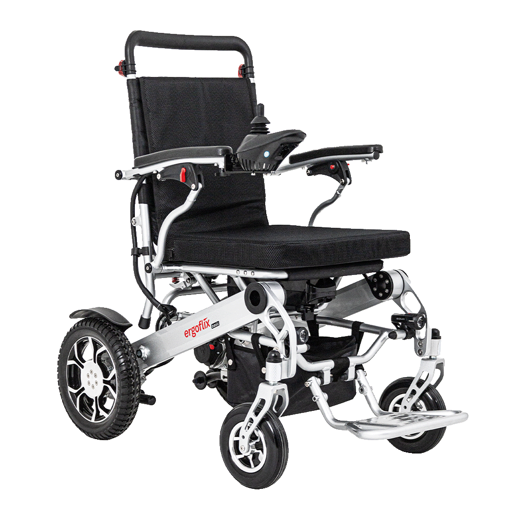 ergoflix Basic Elektro-Rollstuhl Faltbarer Wegbegleiter für Alltagsaktivitäten Hilfsmittelnummer: 18.50.07.0013 Passt zusammengeklappt in nahezu jeden Kofferraum Eignet sich für Auto-, Zug- und Flugzeugreisen Lässt sich in 5 Sekunden ein- und ausklappen Trägt bis zu 120 kg Wiegt nur 24,5 kg Fährt bis zu 15 km in einer Geschwindigkeit von bis zu 6 km/h Steuert sich bequem per Joystick Verfügt über ein intelligentes elektromagnetisches Bremssystem Schneller und zuverlässiger Service Dein Alltag mit dem ergoflix basic: Flexibel, Sicher und Mobil Maximale Mobilität und AnpassungsfähigkeitDer ergoflix basic ist der ideale elektrische Standardrollstuhl für den täglichen Gebrauch. Mit einer beeindruckenden Reichweite von 15 km garantiert er Dir eigenständige Mobilität in Deiner Umgebung. Dank der flexibel einstellbaren Geschwindigkeit von 1 bis 6 km/h passt sich der Rollstuhl Deinen individuellen Bedürfnissen an. Hindernisse? Kein Problem!Ausgestattet mit robusten 8-Zoll-Vorderrädern überwindet der ergoflix basic mühelos größere Hindernisse. Der integrierte Kippschutz sorgt für zusätzliche Sicherheit im Außenbereich, insbesondere beim Überfahren von Unebenheiten. Rundum sichtbar: Tag und NachtFür Deine Sicherheit ist der ergoflix basic mit Beleuchtung ausgestattet. Egal ob bei Tag oder Nacht, Du bist stets gut sichtbar unterwegs, was Dir zusätzliche Sicherheit im Straßenverkehr bietet. Praktisch und PlatzsparendWie alle Elektrorollstühle von ergoflix, ist auch der ergoflix basic faltbar. Diese Eigenschaft erleichtert den Transport erheblich und ermöglicht ein platzsparendes Verstauen, beispielsweise im Wohnungsflur. KrankenkassenunterstützungGut zu wissen: Der ergoflix® basic besitzt die Hilfsmittelnummer 18.50.07.0013 und kann somit von der Krankenkasse erstattet werden. Spare Kosten und profitiere von der Unterstützung Deiner Krankenkasse. Erlebe die perfekte Kombination aus Flexibilität, Sicherheit und Komfort mit dem ergoflix basic – Deinem verlässlichen Begleiter für den Alltag. Bitte lesen Sie vor Gebrauch dieses Produktes aufmerksam die Bedienungsanleitung und halten Sie sich an die Anweisungen des Herstellers. Änderungen vorbehalten. Abbildungen können vom Original abweichen