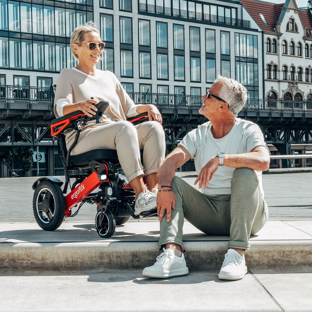ergoflix® LX faltbarer Elektrorollstuhl die ideale Lösung für alle, die im Alltag Wert auf Mobilität, Komfort und Flexibilität legen. Mobilität bedeutet Freiheit und mit dem Ergoflix LX erleben Sie diese Freiheit auf höchstem Niveau. Dieser Rollstuhl wurde für Menschen entwickelt, die aktiv leben und dabei nicht auf Komfort, Sicherheit und modernste Technik verzichten wollen. Mit nur 23,5 kg ist der Ergoflix LX ein echtes Leichtgewicht, das sich im Handumdrehen zusammenklappen lässt ideal für schnelle Ausflüge, Reisen oder den unkomplizierten Transport im Auto. Trotz seines geringen Gewichts trägt er mühelos bis zu 145 kg. So robust und belastbar, wie Sie es brauchen. Das Highlight für höchsten Komfort ist das Softline-Sitzkissen, das im Lieferumfang enthalten ist. Es passt sich perfekt Ihrem Körper an, entlastet gezielt Druckstellen und macht jede Fahrt zum Wohlfühlerlebnis. Die verstellbare Sitzhöhe und die bequeme Rückenlehne sorgen für eine gesunde Haltung – für Stunden voller Komfort ohne Ermüdung. Eine integrierte Vorderradfederung macht das Fahren auch auf unebenen Wegen besonders sanft und angenehm. So erleben Sie maximale Mobilität ohne Kompromisse. Für Ihre Sicherheit sorgt eine moderne Lichtanlage, die auch bei Dämmerung oder Dunkelheit optimale Sicht gewährleistet. Zusätzlich erhöhen reflektierende Elemente an den Rädern Ihre Sichtbarkeit und schützen Sie im Straßenverkehr. Mit einer Reichweite von bis zu 24 Kilometern begleitet Sie der Ergoflix LX zuverlässig auch auf längeren Touren, ohne Sorge vor unerwarteten Pausen. Und mit der verlängerten 3-Jahres-Garantie genießen Sie maximale Sicherheit und Vertrauen in die Qualität Ihres Rollstuhls. Der Ergoflix LX ist mehr als nur ein Rollstuhl – er ist Ihr persönlicher Partner für Unabhängigkeit, Komfort und ein aktives Leben voller Bewegungsfreiheit. Die Vorteile des ergoflix® LX auf einen Blick: Kompakt faltbar – passt in fast jeden Kofferraum Ideal für Reisen mit Auto, Bahn oder Flugzeug (flugzeugtaugliche Akkus) In nur 5 Sekunden ein- und ausklappbar – ganz ohne Werkzeug Hohe Belastbarkeit: bis zu 145 kg Nutzergewicht Leichtgewicht: nur 23,5 kg Eigengewicht (ohne Akku) Reichweite von bis zu 24 km bei 6 km/h – ideal für Alltag und Ausflüge Einfache Steuerung per Joystick – auch für Einhänder geeignet Integriertes elektromagnetisches Bremssystem für mehr Sicherheit Überwindet Steigungen bis zu 21 % problemlos Robuste, wartungsarme Motorentechnologie Schneller Kundendienst und zuverlässiger Support Inklusive ergonomischem Softline-Sitzkissen mit Memory-Schaum – für maximalen Sitzkomfort Hinweis: Angaben basieren auf Herstellerinformationen. Reichweite und Leistung können je nach Nutzung variieren. Eine Kostenübernahme durch die Krankenkasse ist im Einzelfall zu prüfen.