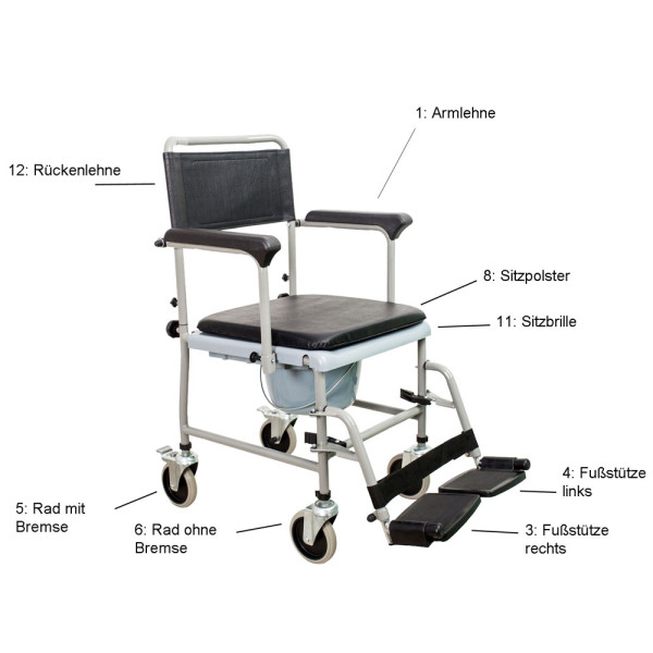 Die Ersatzteile können für Ihren RFM Toilettenstuhl Fahrbar verwendet werden.Ersatzteil 1: ArmlehneErsatzteil 2 (nicht im Bild): Fixierung für ArmlehneErsatzteil 3: Fußstütze rechtsErsatzteil 4: Fußstütze linksErsatzteil 5: Rad mit Bremse (Hinterrad)Ersatzteil 6: Rad ohne Bremse (Vorderrad)Ersatzteil 7 (nicht im Bild): Schraubenset für RäderErsatzteil 8: SitzpolsterErsatzteil 9 (nicht im Bild): Deckel für EimerErsatzteil 10 (nicht im Bild): EimerhalterungErsatzteil 11: SitzbrilleErsatzteil 12: RückenlehneLieferumfang:1 Stück des gewählten Ersatzteils