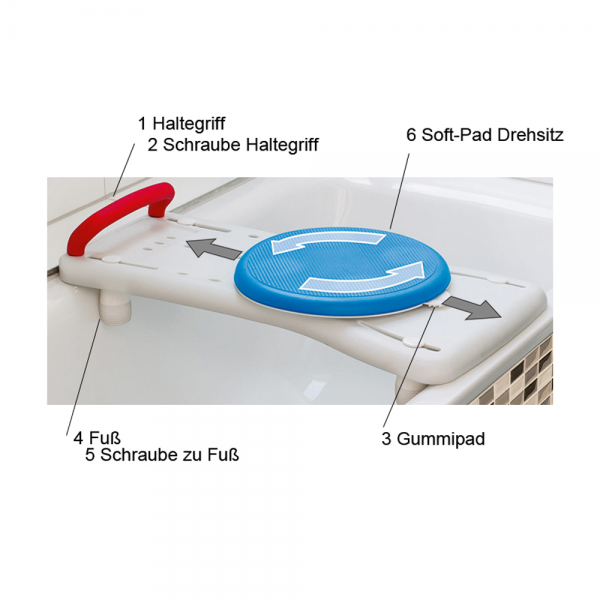 Hier finden Sie Ersatzteile für das Russka Badebrett “Deluxe” mit Soft-Drehsitz. Bitte zur Auswahl dem Artikelnamen und der Bildbeschreibung folgen. Es handelt es sich jeweils im 1 Stück! Ersatzteil 1: Handgriff Ersatzteil 2: Schraube für Haltegriff Ersatzteil 3: Gummipad Ersatzteil 4: Fuß Ersatzteil 5: Schraube für Fuß Ersatzteil 6: Soft-Pad Drehsitz Lieferumfang: 1 Stück des gewählten Ersatzteils