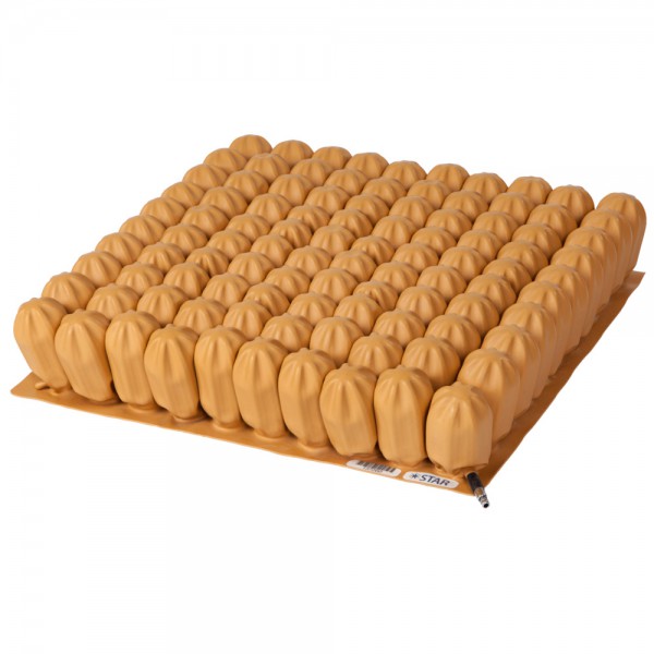 Die neuen Star Cushion Anti-Dekubitus-Kissen werden aus hochwertigem, latexfreiem Neopren gefertigt. Das Material ist antiallergisch, nicht entflammbar und durch seine dicke Wandstärke robust gegen Schäden. Durch eine verbesserte Ventiltechnik kann zudem keine Luft entweichen.Das Anti-Dekubitus-Kissen Star Standard Air bietet den bewährten Hautschutz eines Luftzellenkissens. Die miteinander verbundenen Luftzellen lassen das Gesäß in das Kissen einsinken und verteilen so den Druck gleichmäßig über die gesamte Sitzfläche. Es entsteht ein perfekter anatomischen Abdruck des Gesäßes, der sich bei jeder Änderung der Sitzposition neu an den Benutzer anpasst.Dynamische Anpassung:Das Star Standard verteilt die Luft in den einzelnen Luftzellen automatisch gemäß der anatomischen Form des darauf sitzenden Benutzers. Bei Änderung der Sitzposition passt sich das Kissen automatisch dynamisch an. Es kann vorbeugend oder bei vorhandenem Dekubitus genutzt werden.Luft verbleibt im Kissen:Dicker verarbeitetes Neopren und ein rund gefertigter Zellenfuß sorgen dafür, dass das Star Standard robuster und weniger anfällig für Schäden und Luftverlust ist.Bessere Ventiltechnik:Kein Austreten der Luft durch verbesserte Ventiltechnik. Das Ventil schließt schon bei geringem Kraftaufwand sehr dicht.Maximale Belastbarkeit:Für das Star Standard Air Luftkissen gibt es keine Gewichtsbeschränkung.Material:Kissen: Neoprenrutschfester Bezug: Nylon, Spandex, PolyesterNoppenhöhe:5 cm10 cmBreite x Tiefe:siehe AuswahlGewicht:1,3 kg bis 1,8 kg (größenabhängig)Farbe:goldLieferumfang:1 Stück Etac Star Standard Air Luftkissen in gewählter GrößeInkl. Doppelpumpe, Reparaturset, Bedienungsanleitung