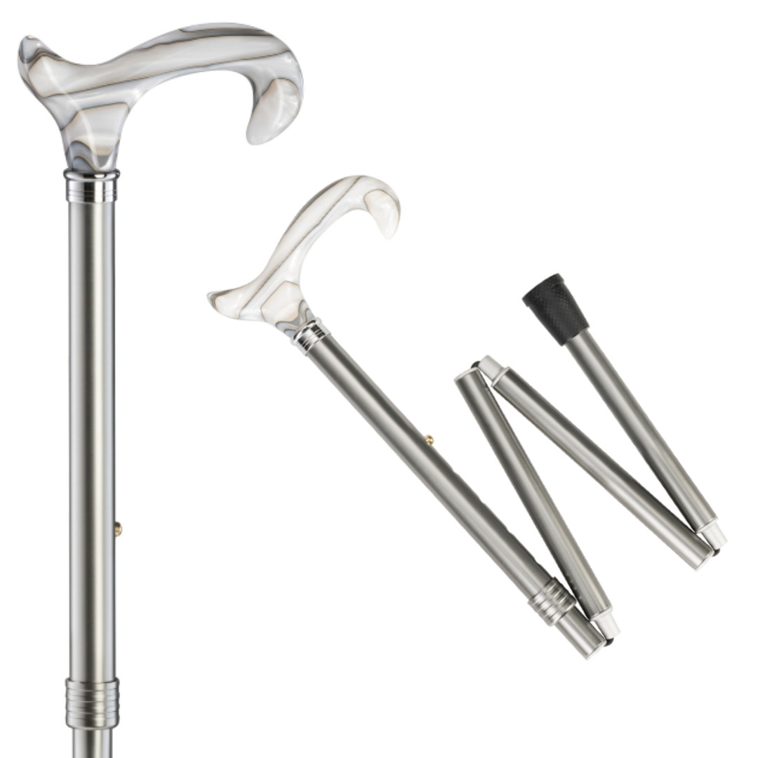 Faltbarer Leichtmetallstock metallic grau mit Derbygriff aus Acryl in silber/weiß