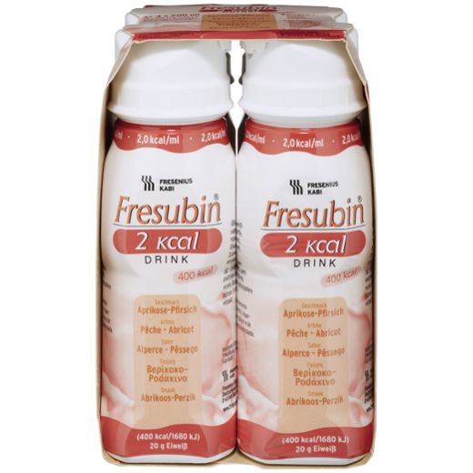 Fresubin 2kcal Drink Pfirsich 4 x 200ml Trinknahrung – so schmeckt Lebensqualität Energiereich Reich an Protein Ballaststofffrei Aprikose-Pfirsich Geschmack Reich an Nährstoffen leckere Geschmacksrichtungen Die Vorteile des Fresubin Trinknahrung DRINK Energiereich mit der konzentrierten Energie von 400 kcal pro EasyDrink Reich an Protein mit 20 g Protein pro EasyDrink Reich an Nährstoffen, denn mit lediglich 2-3 EasyDrinks decken Sie den durchschnittlichen täglichen Bedarf an allen Vitaminen und Spurenelementen Geschmacksrichtungen von Senioren probiert und für lecker befunden* Eiweißreiche (20 g pro EasyDrink) Trinknahrung mit sehr hoher Energiedichte (400 kcal pro EasyDrink) Sehr gut geeignet für Patienten mit frühzeitigem Sättigungsgefühl Erhöhter Eiweißgehalt deckt den Bedarf des katabolen Patienten Sehr hohe Energiedichte schützt Eiweiß vor energetischer Nutzung Dosierung: Mittlere Tagesdosis zur ergänzenden Ernährung: 1-2 EasyDrinks Mittlere Tagesdosis zur ausschließlichen Ernährung: 4-5 EasyDrinks Wichtige Hinweise:Darf nur unter medizinischer Kontrolle verwendet werden. Geeignet zur ergänzenden oder ausschließlichen Ernährung. Achten Sie auf eine ausreichende Flüssigkeitsversorgung. Nicht geeignet für Kleinkinder unter einem Jahr.Anwendung und Aufbewahrung:Lagerung bei Zimmertemperatur. Angebrochene Packungen können bis zu 24 Stunden im Kühlschrank aufbewahrt werden. Vor dem Öffnen gut schütteln und dann langsam trinken.Kontraindikationen:Grundsätzliche Kontraindikationen der enteralen Ernährung wie Dünndarmatonie, Ileus. Leberinsuffizienz, Niereninsuffizienz, akute Pankreatitis in Abhängigkeit vom Status, Stoffwechselstörungen der in Fresubin® 2 kcal DRINK und Fresubin® 2 kcal fibre DRINK enthaltenen Nährstoffe. Servicebereich Prospekt Fresubin 2kcal Drink Typanalyse (Inhaltsstoffe) Bitte lesen Sie vor Gebrauch dieses Fresubin 2kcal DRINK Aprikose-Pfirsich Trinknahrung aufmerksam die Bedienungsanleitung und halten Sie sich an die Anweisungen des Herstellers. Änderungen vorbehalten. Abbildungen können vom Original abweichen.