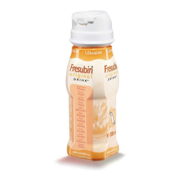 Fresubin® original DRINK * ballaststofffreie Trinknahrung für Patienten mit o normaler Verdauungsleistung o normaler Stoffwechsellage * ausgewogenes Fettsäuremuster für Herz-Kreislauf, Gefäße und Immunsystem * bedarfsdeckende Versorgung mit Vitaminen und Spurenelementen ab 3 EasyDrinks * Trinknahrung im praktischen 200 ml EasyDrink in 4 GeschmacksrichtungenIndikationen * fehlende oder eingeschränkte Fähigkeit zur ausreichenden normalen Ernährung * Mangelernährung * Appetitlosigkeit * Rekonvaleszenz * Chronisch entzündliche DarmerkrankungenKontraindikationen * Krankheitszustände mit grundsätzlicher Kontraindikation der enteralen Ernährung, wie Dünndarmatonie, Ileus. * Schwere organspezifische Störungen, wie Leberinsuffizienz, Niereninsuffizienz, akute Pankreatitis. * Angeborene Stoffwechselstörungen der in Fresubin® original Drink enthaltenen Nährstoffe.Dosierung * Mittlere Tagesdosis zur ausschließlichen Ernährung: 1.500 ml bzw. 7-8 EasyDrinksHinweise zu AnwendungVor Gebrauch schütteln! Anfangs einschleichend dosieren.LagerungRaumtemperatur. Geöffnete Behältnisse im Kühlschrank bis zu 24 Stunden haltbar.