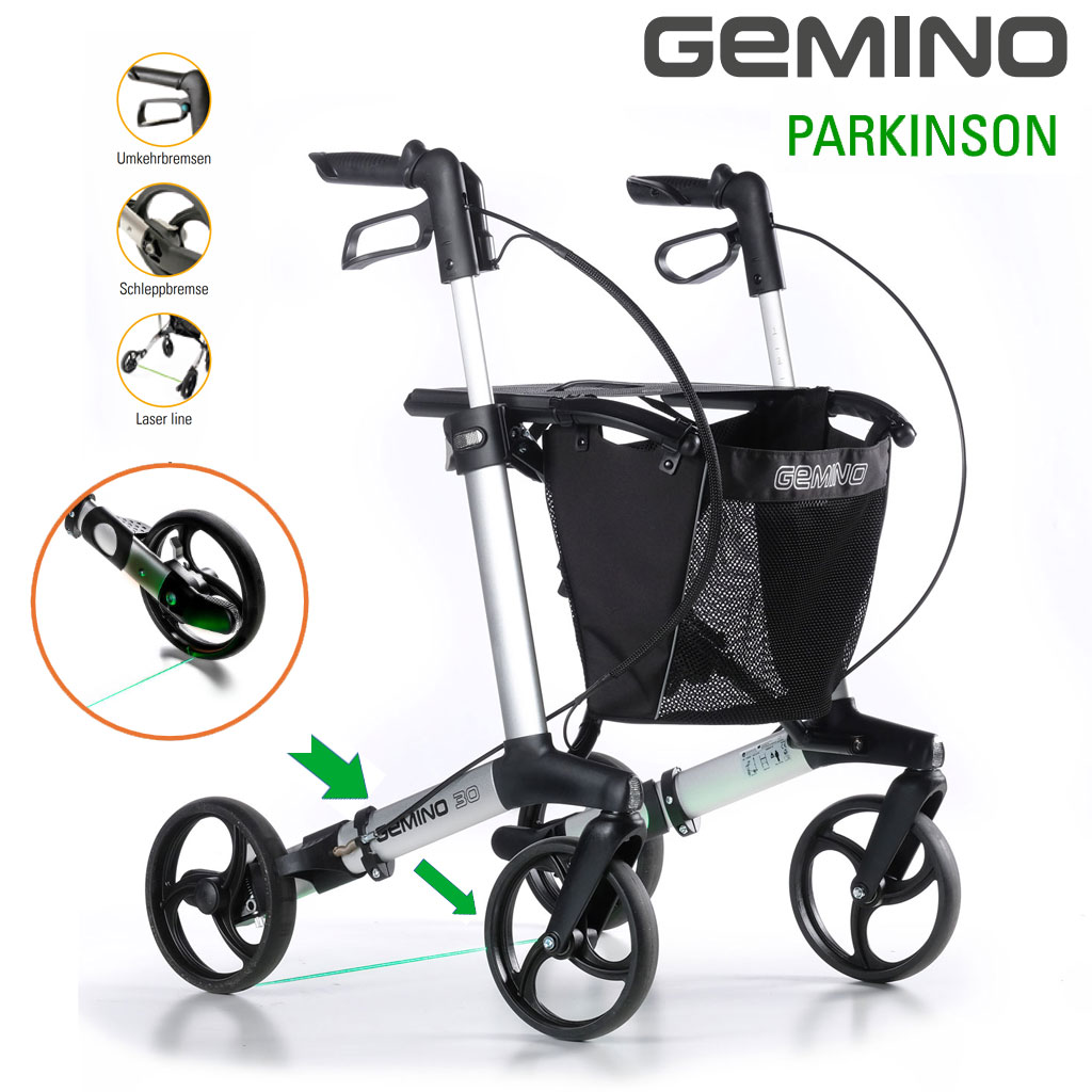 Gemino 30 Parkinson M Rollator (Farbe: Saphirblau) Abbildung zeigt Modell in Grau Der Gemino 30 Parkinson wurde speziell für Menschen mit Parkinson entwickelt und bietet spezielle Funktionen zur Unterstützung bei Gangblockaden und Gleichgewichtsstörungen. Für Personen mit einer Körpergröße von 135 -170cm Umkehrbremssystem Der Rollator hält sofort an, sobald die Bremse losgelassen wird Verlangsamungsbremse bietet zusätzlichen Widerstand und fördert ein gleichmäßiges Gehtempo Wie funktioniert das Laserlicht beim Gemino 30 Parkinson? Eine Laserlinie kann Ihnen helfen, wieder in Gang zu kommen, wenn Sie ”einfrieren”. Mit diesem speziellen Rollator können Sie eine Laserlinie durch Drücken einer Taste an den Schiebegriffen aktivieren. Indem Sie sich auf die Linie konzentrieren, die auf dem Boden erscheint, können Sie darauf treten – und sich wieder in Bewegung setzen. Die Vorteile des GEMINO 30 PARKINSON GLEICHMÄSSIG GEHEN Der Gemino 30 Parkinson ist mit einer Schleppbremse ausgestattet, die zusätzlichen Widerstand bietet und eine gleichmäßige Gehgeschwindigkeit fördert. Die Stärke des Widerstands können Sie ganz einfach an Ihre individuellen Bedürfnisse anpassen. MEHR SICHERHEIT MIT UMKEHRBREMSE Dank des Umkehrbremssystems hält der Rollator sofort an, sobald die Bremse losgelassen wird. Dies erhöht die Sicherheit, wenn Sie beim Gehen das sogenannte „Freezing“ (Einfrieren) erleben – das Gefühl, dass Sie Ihre Füße nicht mehr bewegen können. GANGBLOCKADEN ÜBERWINDEN Im Fall einer Blockade, die das Weiterlaufen unmöglich macht, kann mit einer Taste auf dem Handgriff eine Laserlinie erzeugt werden. Indem Sie sich auf die rote Linie konzentrieren und sie überschreiten, können Sie die Blockade lösen und kommen wieder in Bewegung. Update 2022 – das ist neu Neue Farben für noch mehr Individualität – jetzt auch in Saphirblau Anatomisch geformte Handgriffe für eine einfache, sichere und komfortable Nutzung. Verbesserter Falt-/Entfaltmechanismus, sicheres seitliches Anheben, komfortabler Transport ohne zusätzlichen Verschluss (patentiertes Falt-Klick-System). Höhenverstellbare Schiebegriffe mit Skala, leicht an den Nutzer anzupassen (ohne Werkzeug), sichere Höhenverstellung mit Memory-Funktion. Längere Schiebegriff-Kit (10 cm) passend für besonders große Personen. Verbessertes Taschendesign für einfache und leichte Anbringung – mit einem Klick anzubringenund zu entfernen. Einfache Ein-Hand-Bedienung. Mehr Sicherheit – Durch reflektierende Taschenaufdrucke. Neue Halterung für Rückengurte erlaubt die Höhenverstellung zum sicheren Sitzen. Verbesserter Drucktaster – kann Seitenunabhängig angebracht werden. Verbesserter Anbau des Lasers – Sichere und zuverlässige Fixierung (Servicefreundlich). Laserlicht für Freezing-Situationen Das Laserlicht zeigt eine grüne Linie. In einer Freezing-Situation kann das Laserlicht dazu dienen, ein visuelles Signal zum Weiterlaufen zu geben Knopf drücken, um das Laserlicht zu aktivieren. Das Laserlicht schaltet sich nach 15 +/- 3 Sekunden automatisch aus. Der Laser kann individuell eingestellt werden: Schleppbremse Der Rollator ist mit einem Bremssystem ausgestattet, das verhindert, dass der Rollator bei unabsichtlichen Bewegungen oder abwärts geneigten Strecken davonrollt. ON = Die Bremsen sorgen beim Laufen für einen Widerstand. Bremse aktivieren, indem Sie den Griff herunterdrücken. OFF = Durch das Hochziehen des Griffs wird die Bremse deaktiviert. Wenn das Bremssystem deaktiviert ist, laufen die Räder ohne Widerstand. Lieferung und Zusammenbau Der Rollator ist bei Anlieferung vollständig montiert. Alles was Sie tun müssen ist: Falten Sie den Rollator auseinander. Stellen Sie die Schiebegriffe auf die richtige Höhe ein. Montieren Sie evtl. Zubehör und stellen Sie es richtig ein. Überprüfen Sie die Bremsen und stellen Sie sie bei Bedarf ein. Bitte lesen Sie vor Gebrauch des Gemino 30 Parkinson aufmerksam die beigelegte Anleitung und halten Sie sich bitte an die Anweisungen des Herstellers zur Nutzung des Produktes.