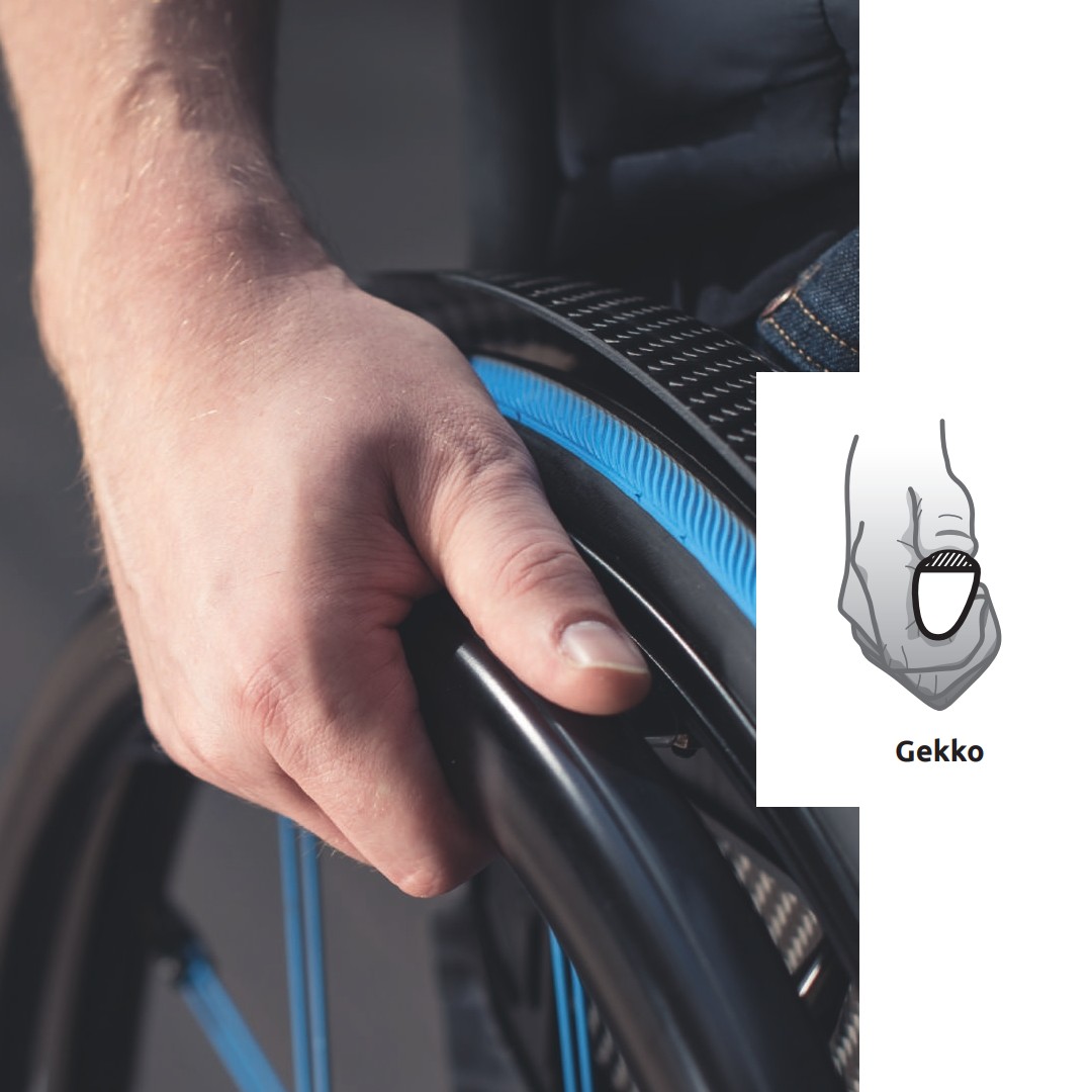 Paraplegiker Greifreifen Gekko Für Rollstuhlfahrer mit vollständiger Handfunktion und mit vollständiger oder verminderter Handkraft Vorteile Perfekte Ergonomie und herausragende Griffigkeit bei gleichzeitig niedrigem Gewicht machen den Gekko zu einem einzigartigen, revolutionären Greifreifen. Die in das Profil vollständig integrierte, robuste und austauschbare Silikonlippe trägt zu den außergewöhnlichen Fahreigenschaften des Greifreifens bei und ermöglicht einen unübertroffenen Fahrkomfort ohne auf die Haut abzufärben. Die eloxierte, reibungsarme Oberfläche an den Seiten reduziert zudem die Hitzeentwicklung beim Bremsen. Geeignet für Rollstuhlfahrer mit vollständiger Handfunktion mit vollständiger Handkraft und vollständige Handfunktion mit verminderter Handkraft Verfügbare Varianten Gekko | 6 Gewinde 22“ Lochkreisdurchmesser: 461mm schwarz 22GG661E21 22“ Lochkreisdurchmesser: 461mm silber 22GG661E31 24“ Lochkreisdurchmesser: 502mm schwarz 24GG600E21 24“ Lochkreisdurchmesser: 502mm silber 24GG600E31 24“ Lochkreisdurchmesser: 515mm schwarz 24GG615E21 24“ Lochkreisdurchmesser: 515mm silber 24GG615E31 25“ Lochkreisdurchmesser: 539mm schwarz 25GG639E21 25“ Lochkreisdurchmesser: 539mm silber 25GG639E31 Gekko | 6 Laschen 22“ Laschenabstand: 465mm schwarz 22GL665E21 22“ Laschenabstand: 465mm silber 22GL665E31 24“ Laschenabstand: 512mm schwarz 24GL615E21 24“ Laschenabstand: 512mm silber 24GL615E31 24“ Laschenabstand: 523mm schwarz 24GL623E21 24“ Laschenabstand: 523mm silber 24GL623E31 25“ Laschenabstand: 535mm schwarz 25GL635E21 25“ Laschenabstand: 535mm silber 25GL635E31 26“ Laschenabstand: 565mm schwarz 26GL665E21 26“ Laschenabstand: 565mm silber 26GL665E31 26“ Laschenabstand: 576mm schwarz 26GL676E21 Empfehlung für Profilgröße und Beschichtung Gern empfehlen wir den Gekko ”S” für kleine Hände als auch für Kinderhände. Kinder lernen so bereits in jungen Jahren das richtige Greifen.