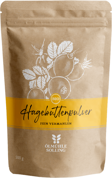 Hagebuttenpulver vermahlen aus kontrolliert biologisch angebauten Hagebutten. Ideal zum Zubereiten von Tee, Smoothies und Säften. Vegan und laktosefrei.