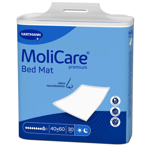 Die neu entwickelte MoliCare® Premium Bed Mat 9 Tropfen in 40×60 cm ist eine besonders saugfähige und weiche Bettschutzeinlage für eine hygienische Versorgung und zusätzlichen Schutz.Superabsorbierender Kern nimmt Flüssigkeit sicher auf und bietet zusätzlich Schutz für unterschiedliche OberflächenSaugkern aus Zellstoff-Flocken und superabsorbierendem PolymerDermatologisch getestet und hautfreundlichWeiche Oberfläche mit diskreter textilähnlicher Außenfläche für angenehmen KomfortSaugleistung ISO Wert: 1168 gVideo: