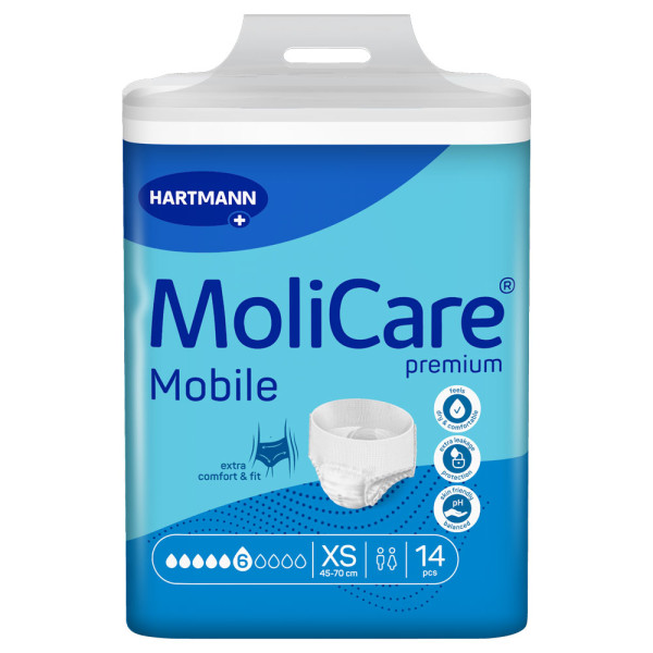 Die Hartmann MoliCare® Premium Mobile sind Inkontinenzslips, die sich wie normale Unterwäsche tragen lassen.Das Nachfolgermodell ist noch sicherer, diskreter und schneller:Verbesserter Auslaufschutz und KomfortDünner und niedrigerer BundMit MoliCare SkinGuard® Saugkörpertechnologie für ein Sofort-Trocken-Gefühl und HautgesundheitSaugstärke:6 10Bauch- Hüftumfang:45 – 70 cm = Größe XSLieferumfang:1×14 Stück Hartmann MoliCare® Premium Mobile 6 Tropfen XS