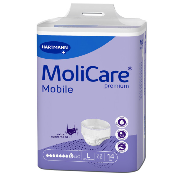 Die Hartmann MoliCare® Premium Mobile sind Inkontinenzslips, die sich wie normale Unterwäsche tragen lassen.Das Nachfolgermodell ist noch sicherer, diskreter und schneller:Verbesserter Auslaufschutz und KomfortDünner und niedrigerer BundMit MoliCare SkinGuard® Saugkörpertechnologie für ein Sofort-Trocken-Gefühl und HautgesundheitSaugstärke:8 10Bauch- Hüftumfang:100 – 150 cm = Größe LLieferumfang:1×14 Stück Hartmann MoliCare® Premium Mobile 8 Tropfen L