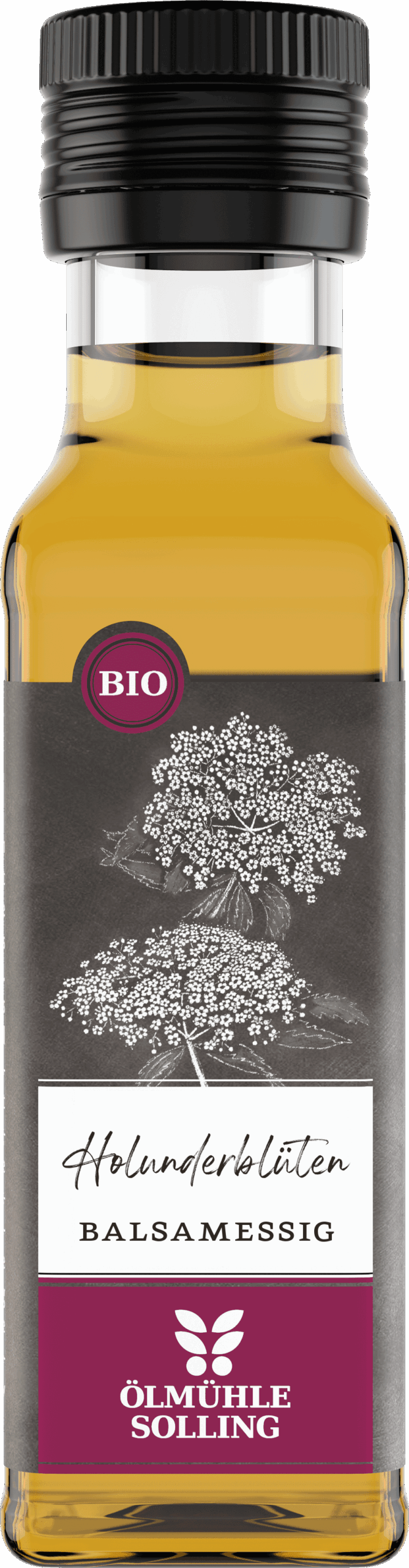 Hergestellt durch natürliche Fermentation von Holunderblütensirup, veredelt mit Riesling-Essig und Zitrone. Setzt außergewöhnliche Akzente in frischen Blatt- und Rohkostsalaten.