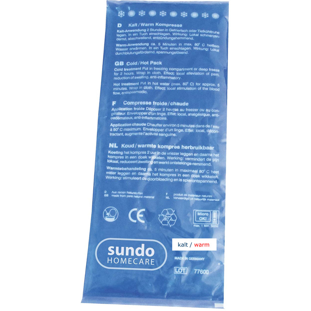 Kalt-Warm Kompresse 12 x 29 cm Kunststofffolie blaues Gel weiches Gelkissen für Kalt- oder Warm-Anwendung mikrowellengeeignet Maße: ca. 12 x 29 cm PZN 10076820 Bitte lesen Sie vor Gebrauch von diesem Produkt aufmerksam die Bedienungsanleitung und halten Sie sich an die Anweisungen des Herstellers. Änderungen vorbehalten. Abbildungen können vom Original abweichen.