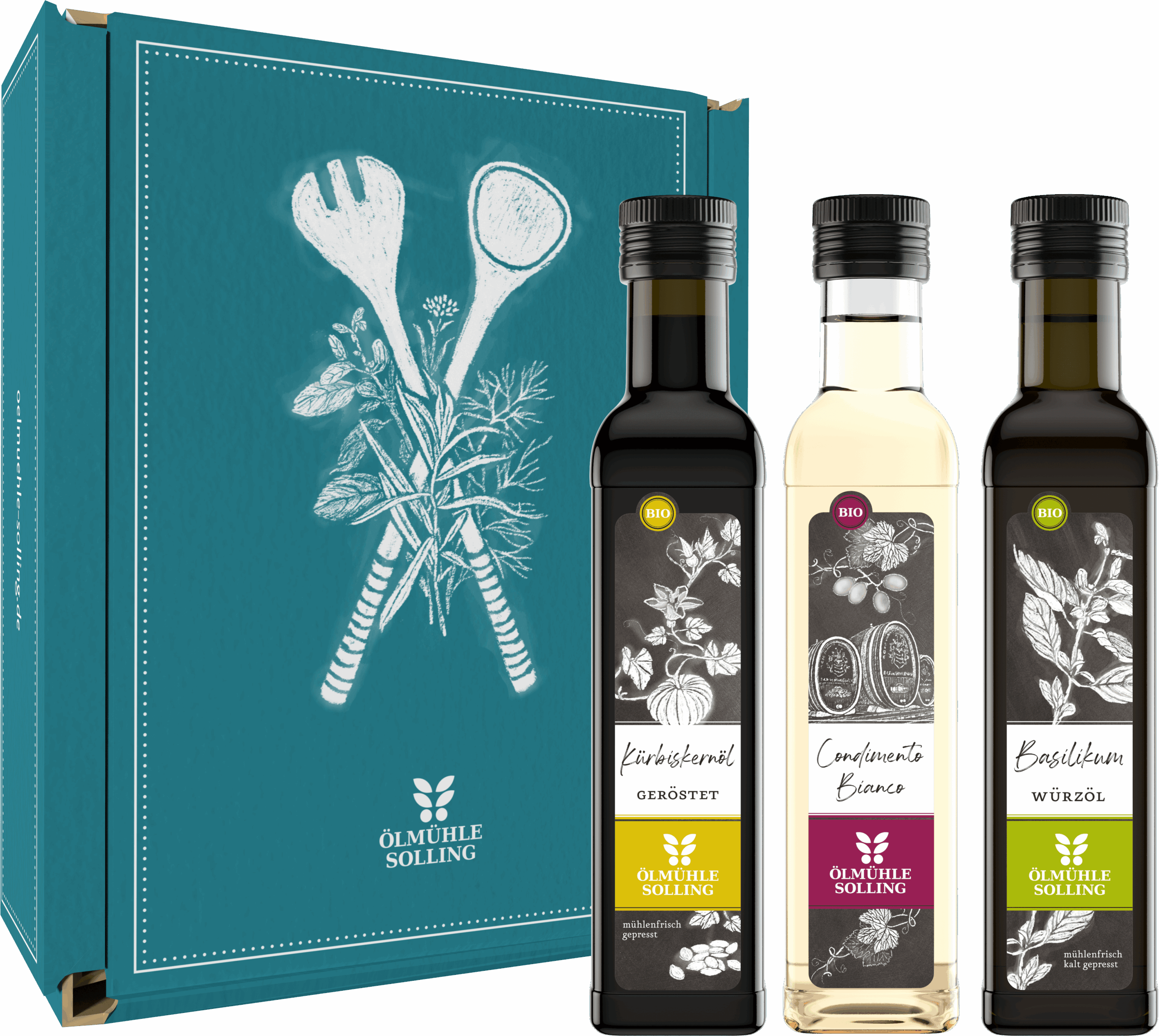 Dieses Set aus drei 250 ml Flaschen besteht aus Kürbiskernöl geröstet, Condimento Bianco und Basilikum Würzöl. Die klassischen Lieblinge eignen sich perfekt zum Verschenken.