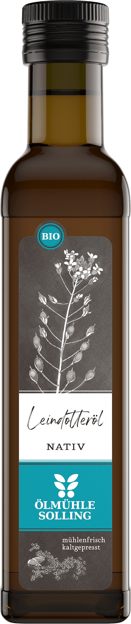 Dieses Leindotteröl überzeugt durch seinen hohen Anteil an Omega-3-Fettsäuren von zirka 40 g pro 100 g. Es wird aus Bio-Leindottersaat kaltgepresst und hat einen erbsigen Geschmack.