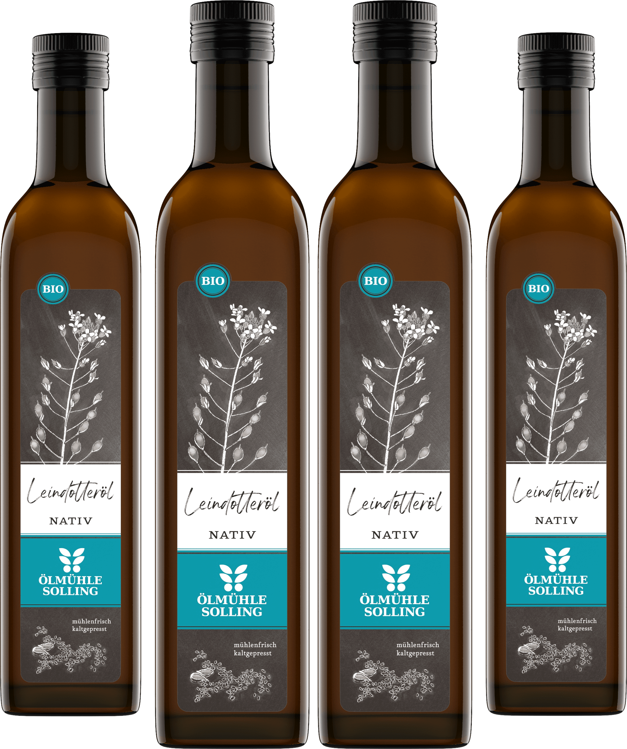 Dieses Leindotteröl überzeugt durch seinen hohen Anteil an Omega-3-Fettsäuren von zirka 40 g pro 100 g. Es wird aus Bio-Leindottersaat kaltgepresst und hat einen erbsigen Geschmack.