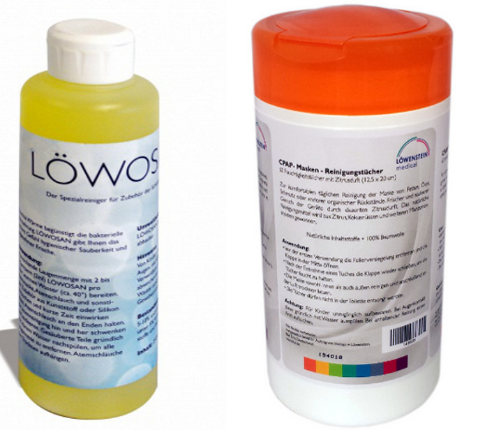 Löwenstein Löwosan CPAP Masken Spezialreiniger 250 ml Masken Reiniger Silikonreiniger Spezialreiniger zur Reinigung der Atemmaske, Schlauch und sonstigem Zubehör aus Kunststoff oder Silikon hygienisch sauber und angenehm frisch äusserst ergiebig, 2 – 3 Spritzer (2 ml ) pro Liter warmem Wasser Bestandteile: 5-10% anionische Tenside, amphotere Tenside unter 5% verwendete Hilfs-, Duft- und Farbstoffe sind biologisch unbedenklich Löwenstein CPAP Masken Reinigungstücher Zitrus 62 Tücher Inhalt: 62 Stück aus 100% reiner Baumwolle Die spezielle, zu 100% natürliche Formel, enthält angenehme Zitrus Düfte geeignet für die tägliche Reinigung der CPAP-Masken, Schläuche und Zubehör sichere und effektive Anwendung sanft für Hände und das Gesicht biologisch abbaubar – Latexfrei Eine Verpackung enthält 62 Zitrus-Duft Feuchttücher