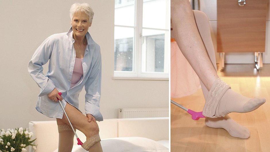 Medi Butler Off Ausziehhilfe Der medi Butler Off ist ausgesprochen bequem zu handhaben. Das Ausziehen der Strümpfe funktioniert mühelos und ohne erhöhten Kraftaufwand. Die Geschwindigkeit des Bewegungsablaufes bestimmen Sie. Mit der Ausziehhilfe kommen Sie auch langsam an Ihr Ziel. Sie ist sowohl für Rechts- als auch für Linkshänder geeignet. Für mobile und immobile Patienten Für alle Strumpflängen und -ausführungen Auch für Pflegekräfte ein ideales Hilfsmittel Stabil und extrem einfach in der Handhabung Maximale Sicherheit beim Ausziehen Nicht geeignet für Qualitätsstufe Forte und Flachstrick Ausziehen von Kompressionsstrümpfen in Sekunden Ausziehen von Kompressionsstrümpfen leicht gemacht: Mit dem medi Butler off lassen sich Kompressionsstrümpfe in Sekunden ausziehen, und das ohne große Kraftanstrengung und ohne den Rücken zu Belasten. Der medi Butler off erinnert in der Form an einen Schuhlöffel, der an einem langen Stab befestigt ist. Er kann auch zum An- und Ausziehen von Schuhen verwendet werden. Mit dem medi Butler off können Patienten bequem den Bund des Kompressionsstrumpfes fassen und den Strumpf vom Bein streifen. Das schont nicht nur den eigenen Rücken, sondern auch Bund und Gestrick des Kompressionsstrumpfes. Damit haben Sie länger Freude an Ihren Hilfsmitteln. Bei der Auswahl gilt jedoch zu beachten: Der medi Butler off ist nicht für mediven forte und flachgestrickte Kompressionsstrümpfe geeignet. Vorteile der Medi Butler Off Unabhängig Wenn Sie Rückenprobleme oder Schwierigkeiten beim Bücken haben, wird Ihnen der medi Butler Off, unabhängig von Ihrem Alter, wertvolle Dienste leisten. Er ermöglicht das Ausziehen von Strümpfen ohne fremde Hilfe. Praktisch Aufgrund der durchdachten Ergonomie lässt er sich einfach und mühelos anwenden und passt in jede Tasche. Schonend Die Ausziehhilfe wurde in Zusammenarbeit mit Ergotherapeuten und Ärzten entwickelt und getestet, mit hochwertigen Materialien hergestellt und besonders sorgfältig verarbeitet (kein Zwicken oder Kratzen). Ihre Kompressionsstrümpfe oder Strümpfe werden bei richtiger Anwendung nicht beschädigt. (Bitte beachten Sie die Gebrauchsanweisung). Hygienisch Die Ausziehhilfe ist hygienisch. Wenn nötig, lässt sie sich ganz einfach mit Wasser und Seife oder handelsüblichen Desinfektionsmitteln reinigen. Sie ist strapazierfähig, nutzt sich nicht ab und wird Ihnen daher lange Zeit gute Dienste erweisen. Weitere Anwendungsbereiche: Der medi Butler Off eignet sich auch hervorragend als Ausziehhilfe für normale Strümpfe oder als Schuhlöffel. VIDEO