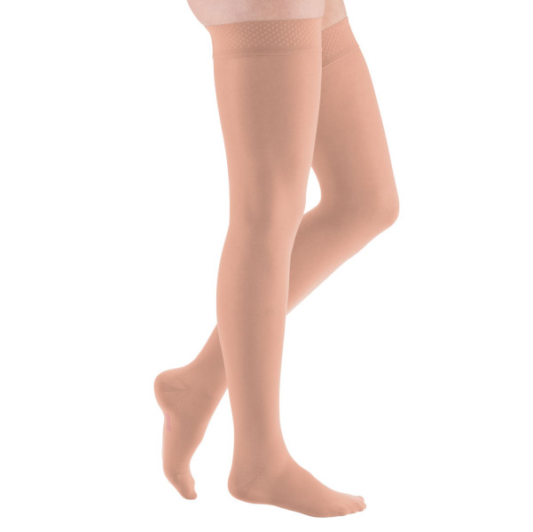 Die mediven elegance Schenkelstrümpfe sind besonders weich und in vielen schönen Farben erhältlich. Sie haben einen elastischen Strickfaden, der für weniger Druckempfinden sorgen soll.Mehr Zehenfreiheit und Komfort im Vorfußbereich durch Soft-Elastic-FußspitzeSehr angenehmes Gefühl in der Kniekehle Besonderes hautfreundlichVerkleinerte Ferse für faltenfreien SitzNoch unauffälliger im SchuhBesondere Haltbarkeit durch doppelte FersenverstärkungBesonders breites und weich gearbeitetes Bündchen für perfekten Halt und ein angenehmes TragegefühlKompressionsklasse I: Kompression in mmHG 18.0 – 21.0, Kompression in kPa 2.40 – 2.80Geschlossene FußspitzeVARIANTE OHNE HAFTBAND – MIT NORMALEN TRIKOT-ABSCHLUSSRANDLänge:normal: 72 – 83 cmGrößen (Fesselumfang):18-20 cm = I20-22 cm = II22-24 cm = III24-26 cm = IV26-28 cm = V28-30 cm = VI30-32 cm = VIIFarbe:schwarzweißanthrazitmedi magentacaramelbeigerosébronzeMaterial:34% Elastan66% PolyamidIndikationen:Varikoseprimäre und sekundäre VarikoseVarizen in der SchwangerschaftDie Sklerosierungstherapie unterstützendNach venenchirurgischen Eingriffen Chronische Veneninsuffizienz (CVI) des Stadiums I nach Widmer bzw. C1 und C2 nach CEAPThromboseprophylaxe bei mobilen PatientenThrombophlebitis (superfiziell) sowie Zustand nach abgeheilter PhlebitisLieferumfang:1 Paar mediven elegance CCL1 AG Schenkelstrümpfe