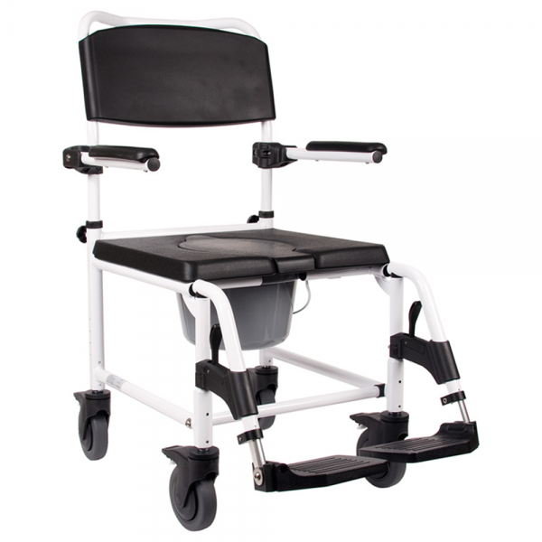 Der Dusch- Toilettenrollstuhl “Kakadu” lässt sich durch die 5 Zoll Räder leicht im Bad manövrieren. So ist es möglich, sich auch mit motorischer Behinderung in den eigenen vier Wänden halbwegs selbstständig bewegen zu können.Produktinformationen:Rahmen aus weiß eloxiertes AluminiumSitz, Arm- und Rückenlehne aus schwarzem weichen PUReinstellbare SitzhöheSitzfläche mit Hygieneöffnung und AbdeckungWC Eimer serienmäßigArmlehnen umklapp- und abnehmbarabnehmbare schwenkbare Fußrasten, in der Höhe einstellbarSerienmäßig mit 4 arretierbaren 5″ Rädern ausgestattet24″ Hinterräder mit Bremsen optional lieferbar (zusätzlich zu bestellen)Technische Daten:max. Benutzergewicht (Traglast): 130 kgLeergewicht (montiert): 12,9 kgSitztiefe: 43 cmGesamttiefe: 93 cmSitzbreite: 45 cmmax. Breite (inkl. Armlehnen): 56 cmGesamthöhe einstellen (in Stufen von 25 mm): 90 – 95 cmSitzhöhe einstellbar (in Stufen von 25 mm): 49 – 54 cmÜberfahrhöhe (Höhe bis Sitz): ca. 42 – 47 cmLieferumfang:1 Dusch- Toilettenrollstuhl “Kakadu”