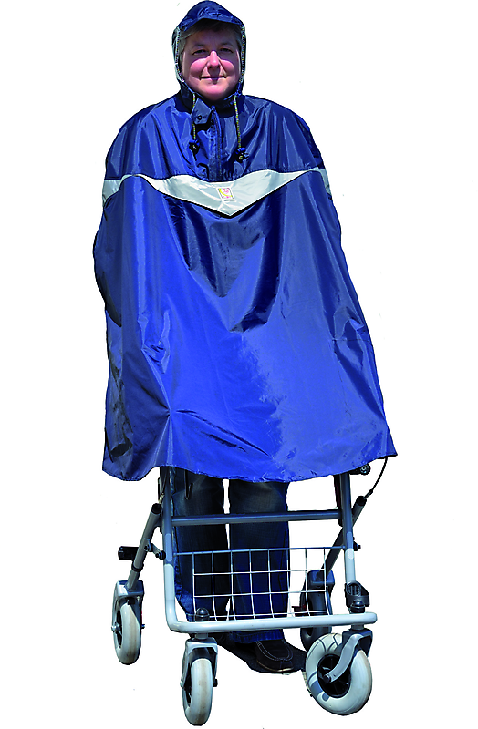 ROLLATOR – PONCHO B Passend für Sie und Ihren Rollator. Mit dem MPB Poncho bleiben Sie und Ihr Gehwagen trocken trotz Regen. dunkelblau mit Reflektorstreifen, vorn und hinten 100% Nylon, extrem wasserfest doppelt genäht Nähte zusätzlich verschweißt atmungsaktiv durch Rückenlüftung Kapuze mit Sichtfenstern Wasserdicht