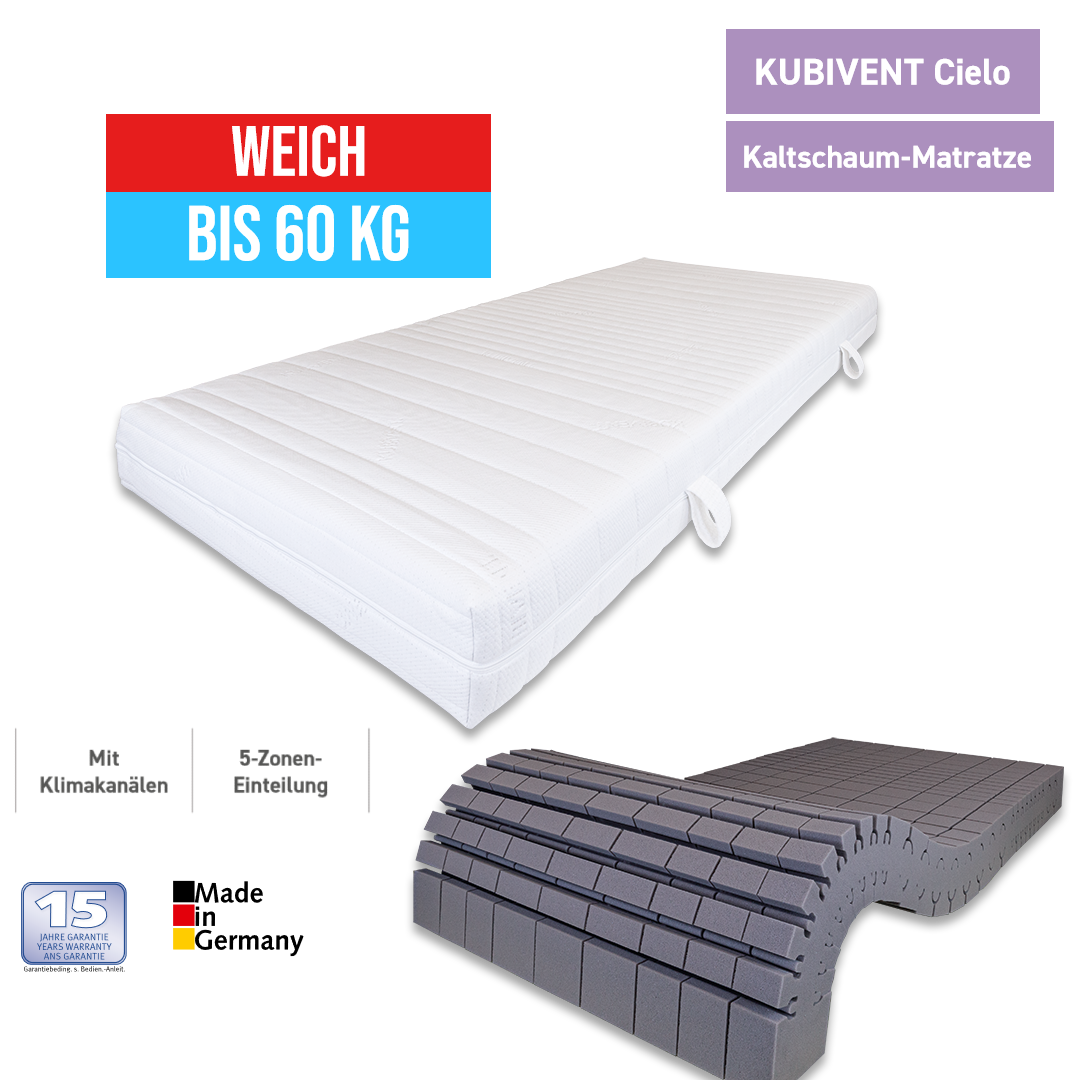 Neue Kubivent CIELO Kaltschaum-Matratze, weich 0-60kg, mit 5-Zonen-Einteilung, gesunder Schlaf für Rücken- und Nackenschmerzen, Allergie-Bezug CINQUE