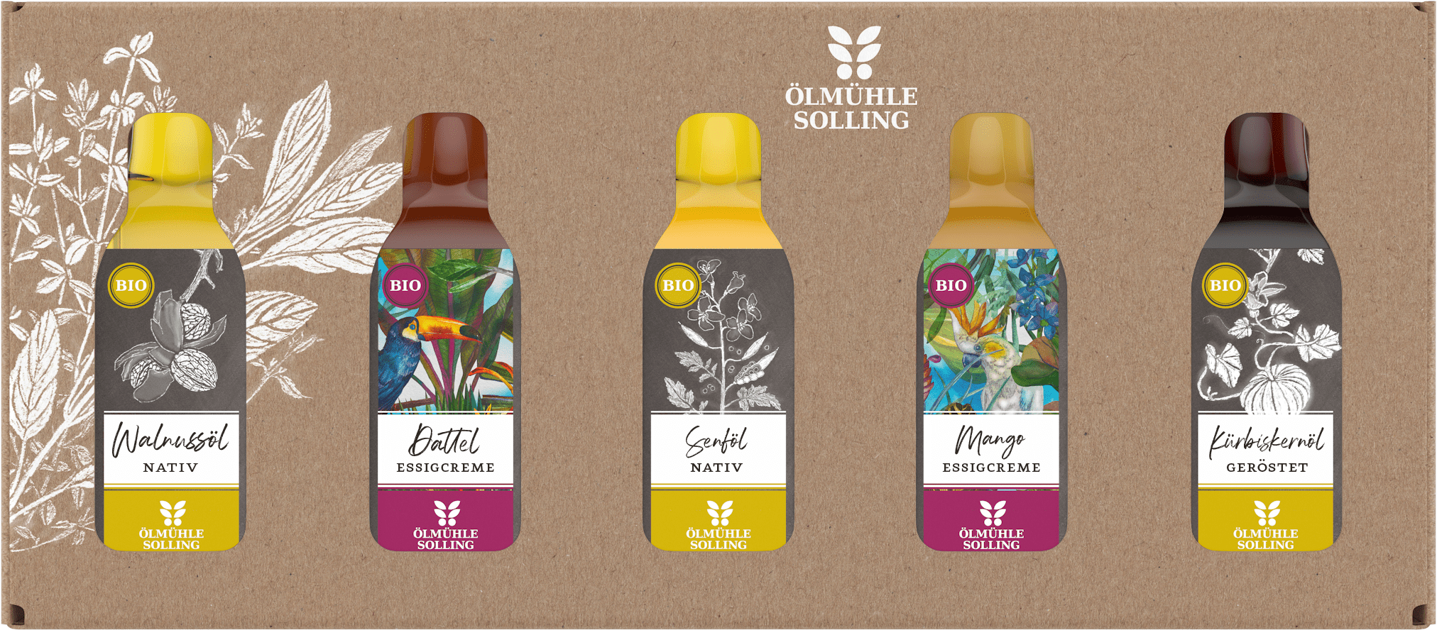 In diesem Set erhalten Sie fünf unserer köstlichen Öle und Essige à 20 ml – perfekt zum Probieren oder Verschenken: Walnussöl, Senföl, Kürbiskernöl, Dattel und Mango Essigcreme.