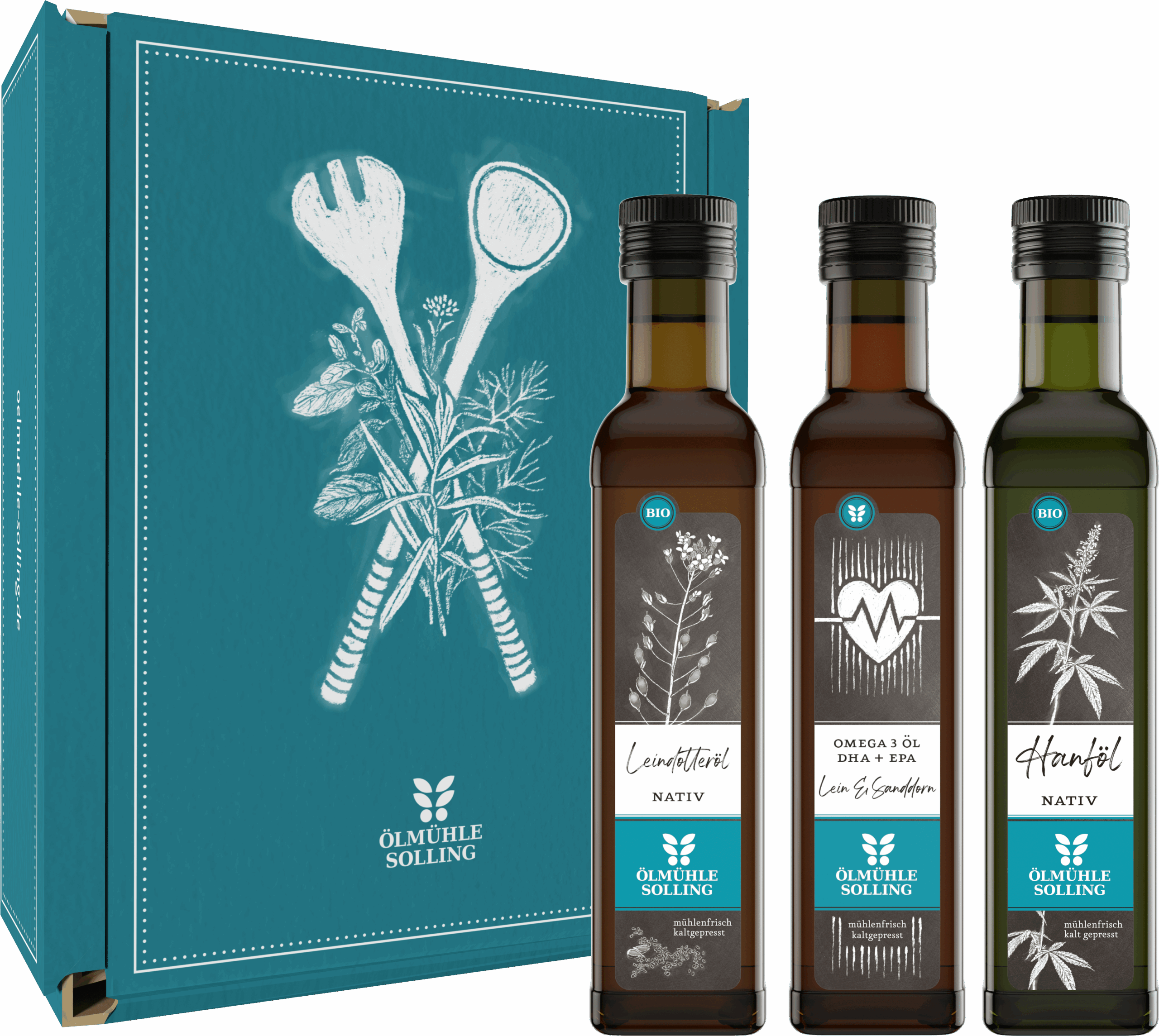 Dieses Set aus drei 250 ml Flaschen Omega 3 Öl Lein & Sanddorn mit DHA + EPA Algenöl, Leindotteröl und Hanföl. Unsere Omega 3 Lieblinge sind das ideale Geschenk für gesundheitsbewusste Genießer.