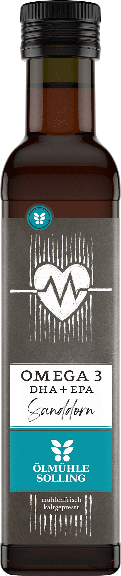 Das Omega 3 Öl Lein & Sanddorn ist eine Kombination aus wertvollem Algenöl, mühlenfrisch kaltgepresstem Leinöl und Sanddornfruchtfleischöl. Nur ein Esslöffel liefert das gesamte Spektrum an essenziellen Omega 3 – Fettsäuren: ALA, DHA und EPA.