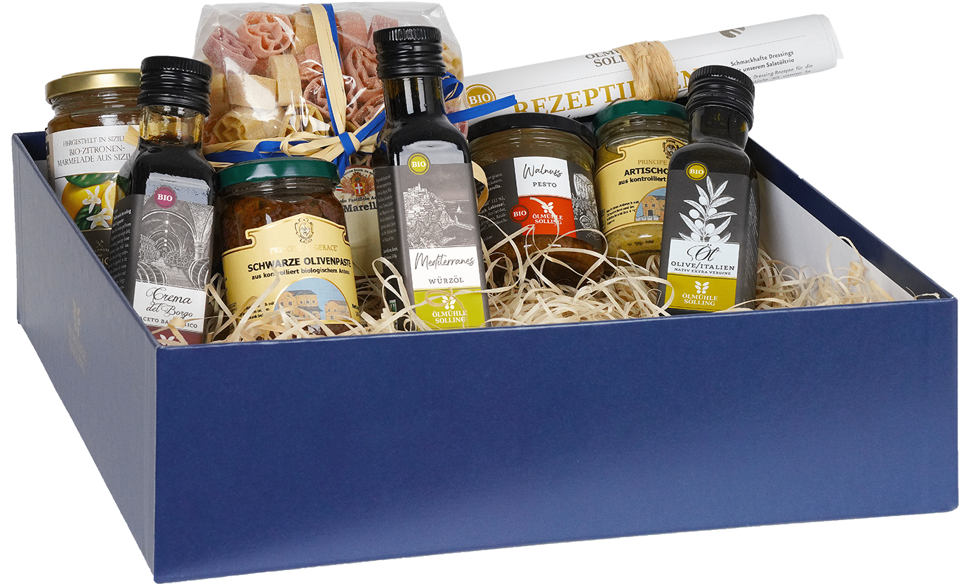 Präsentbox Mediterrane Klassiker ausgewählte Spezialitäten für eine Reise ans Mittelmeer 1