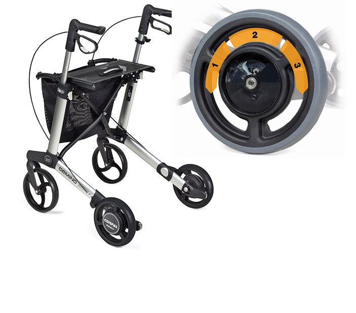 Gemino 30 SpeedControl RÄDER (ohne Rollator) zum nächträglichen Anbau an Ihren Gemino 30 Die Innovation unter dem Rollator-Zubehör. Für maximale Sicherheit beim Gehen. Sie suchen nach einem Rollator, der Ihnen ein Höchstmaß an Sicherheit beim Gehen bietet? Dann ist der Gemino 30 Speedcontrol mit seinem innovativen dynamischen Bremssystem genau der Richtige für Sie. Die Fliehkraftbremsen an den Hinterrädern bremsen bei einer Erhöhung der Gehgeschwindigkeit automatisch mit. Sofern Sie nur langsam gehen oder der Weg ansteigt, ist der Bremswiderstand nicht zu spüren. Die Vorteile des Gemino SpeedControl SpeedControl Bremssystem für maximale Sicherheit Das innovative SpeedControl-Bremssystem verfügt über eine 3-Stufen-Bremse und kann leicht an Ihre spezifischen Bedürfnisse angepasst werden. Wenn Sie beschleunigen, bremsen die Fliehkraftbremsen an den Hinterrädern automatisch, womit eine aufrechte Haltung und weiche Gangart gewährleisten wird. SpeedControl ​​fördert ein stetiges Tempo und sorgt dafür, dass Sie näher am Rollator laufen. Dadurch wird verhindert, dass der Rollator zum ”Ausreißer” wird oder Sie gar stürzen. Große Hilfe für Gehübungen Die Besonderheit des Gemino 30 SpeedControl ist seine einzigartige Funktion, ​​Ihren Gang durch kontrollierten Widerstand gleichmäßger zu machen. Das macht ihn auch zu einem Trainingspartner, wenn Sie wieder gehen lernen müssen. Sie können sich komplett auf die Abfolge der Bewegungen konzentrieren, während Ihr Rollator eine aufrechte Haltung und ein gleichmäßiges Tempo unterstütz. Verwenden Sie die unterschiedlichen Bremsstufen zum Einstellen des Rollators, je nachdem welche Fortschritte Sie während ihrer Rehabilitation machen. Auch ein perfekter Begleiter für Kinder Der Gemino 30 S SpeedControl, das kleinste Modell, ist auch eine große Gehhilfe für Kinder, so dass sie die Welt in aller Sicherheit entdecken können. Mit den Geschwistern zum Spielplatz gehen? Oder mit Freunden ein Eis essen gehen? Mit dem dynamischen Bremssystem macht das Gehtraining Spaß!100% Gemino Rollator Den Gemino 30 SpeedControl gibt es in drei Baugrößen (30, 30M und 30S). Er vereint große therapeutischen Nutzen mit allen Vorteilen unseres preisgekrönten Gemino 30 Rollator. 100% Komfort, Sicherheit und Design. 3-STUFIGES BREMSSYSTEM Das innovative SpeedControl-Bremssystem kann je nach Bedarf in drei Stufen auf Ihre Bedürfnisse eingestellt werden. Sobald sich Ihre Gehgeschwindigkeit erhöht, werden die Fliehkraftbremsen an den Hinterrädern automatisch aktiviert. Dieser Widerstand ist natürlich nicht zu spüren, wenn Sie langsam gehen oder der Weg ansteigt. -&gt, passt nicht für Gemino 60 Rollatoren Bitte lesen Sie vor Gebrauch von diesem Produkt aufmerksam die Bedienungsanleitung und halten Sie sich an die Anweisungen des Herstellers. Änderungen vorbehalten. Abbildungen können vom Original abweichen.