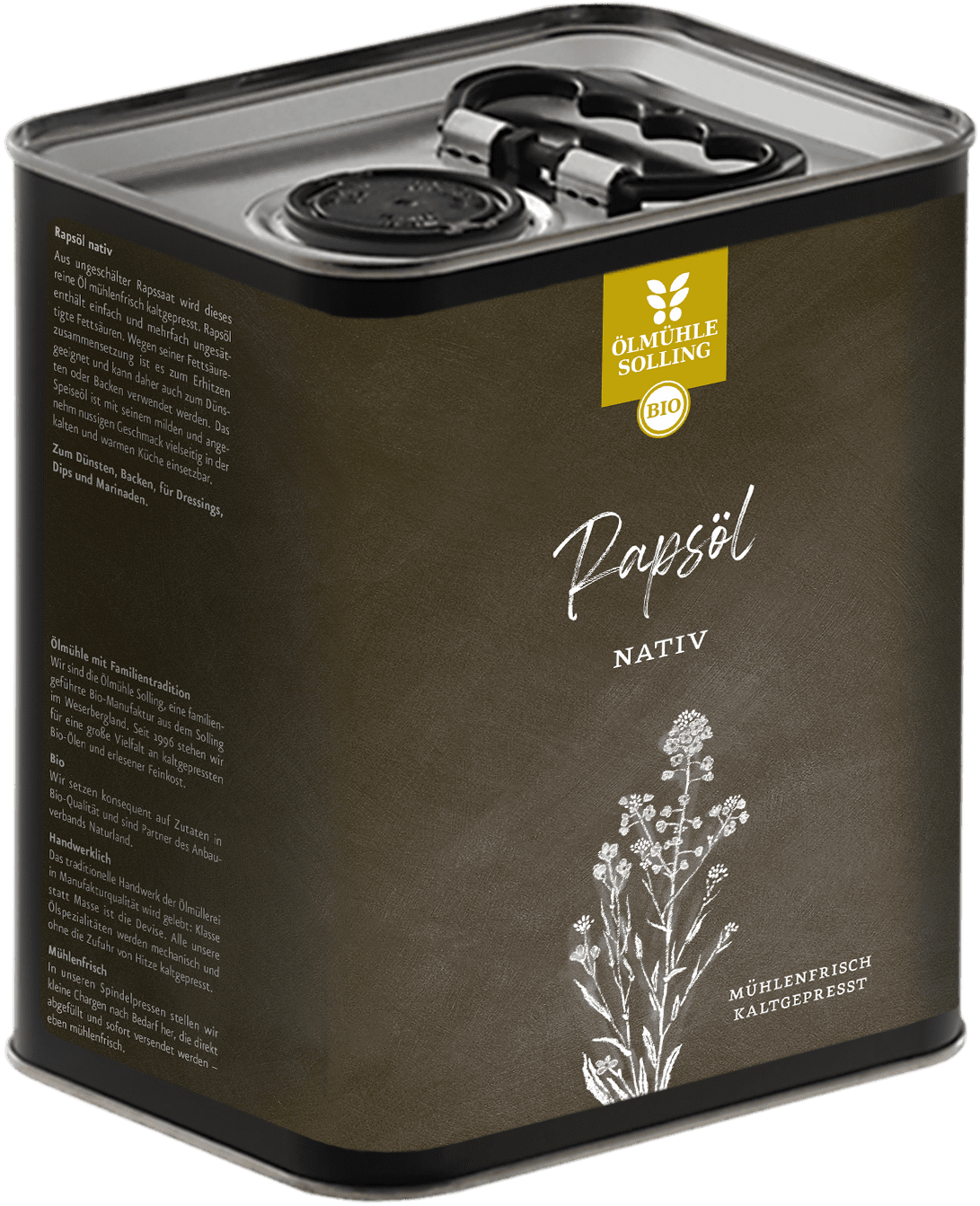 Dieses reine Rapsöl wird schonend aus ungeschälter Bio-Rapssaat mühlenfrisch kaltgepresst. Es hat einen arttypischen Geschmack und eignet sich zum Kurzbraten, für Dips und Dressings.