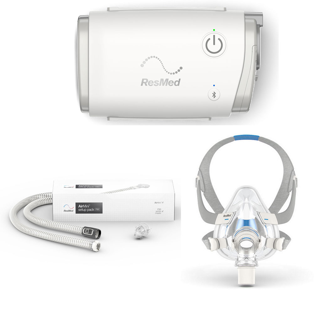 Resmed AirMini AutoSet inkl. F20 Set mit Maske & Schlauch, mobiles Therapiegerät mit Netzteil und Transportbeutel, AirMini APAP und CPAP Reisegerät (Komplettpreis) (#1235995)