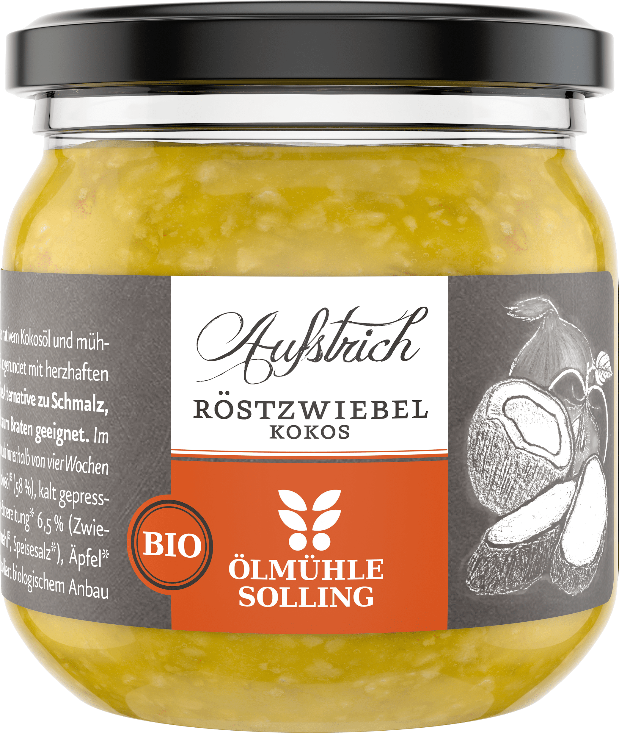 Herzhafter, veganer Bio-Aufstrich mit Kokosöl und mühlenfrischem, kaltgepresstem Leinöl, verfeinert mit würzigen Röstzwiebeln und Apfelchips.
