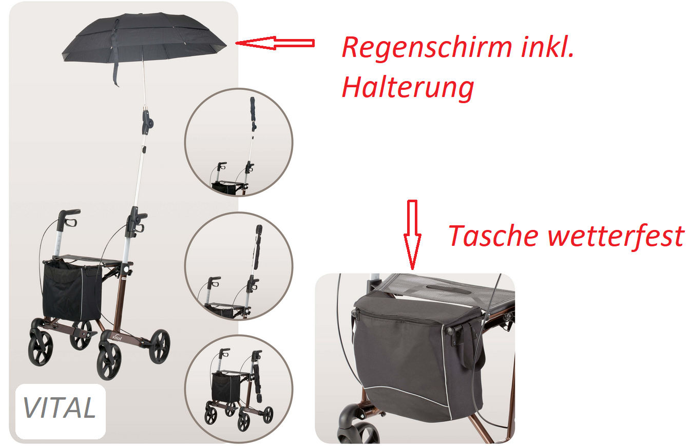 Russka Allwetter Zubehörpaket für Vital Rollator Das Allwetter-Zubehörpaket für den Vital Rollator beinhaltet einen Regenschirm mit Halterung und eine wetterfeste Tasche. Der Regenschirm schützt bei schlechtem Wetter vor Regen und spendet Schatten an heißen Tagen. Er ermöglicht es, den Rollator sicher mit beiden Händen schieben und bremsen zu können. Die Vorteile des Russka Vital Allwetter Zubehörpaket Die Höhe des Schirms können Sie nach Bedarf in mehreren Stufen einstellen. Wenn Sie ihn einmal nichtbenötigen lässt er sich platzsparend zusammen klappen. Die wetterfeste Tasche passt hervorragend auf die Haltestangen des Rollator Vital. An der Vorderseite befindet sich eine gut sichtbare Reflektornaht. Dank des langen Reißverschlusses lässt sich die Tasche leicht öffnen und schließen. Der Tascheninhalt wird vor Regen und fremden Zugriffen geschützt. Bitte lesen Sie vor Gebrauch des Zubehörpaketes aufmerksam die Bedienungsanleitung und halten Sie sich an die Anweisungen des Herstellers. Änderungen vorbehalten. Abbildungen können vom Original abweichen.
