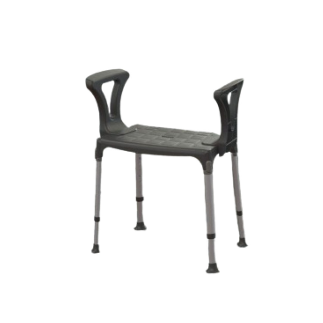 RUSSKA Laguna Duschhocker mit Armlehnen Sicheres Duschen wird zum Erlebnis – jetzt auch in schwarz Der Duschhocker aus der Serie laguna vereint schickes Design mit höchster Qualität und Flexibilität. Auf diesem eleganten und leichten Raumwunder wird die tägliche Hygiene selbst in kleinen Duschen zum Erlebnis. Höhenverstellbarer Duschhocker Noch mehr Sicherheit und Unterstützung beim Hinsetzen und Aufstehen bieten die Armlehnen. Diese zeichnen sich durch ihre angenehm breite Auflagefläche sowie die werkzeuglose, sehr einfache Montage aus. HMV 04.40.03.1027 Maße: Sitzfläche: 30,5 x 30,5 cm (L x B) bzw. 50 x 30 cm Stellfläche: 36 x 36 cm (L x B) bzw. 55 x 39 cm Höhenverstellbarkeit: 39–54 cm (7-fach) Armlehnen: 26 x 23 x 6 cm (L x H x T) Breite zwischen den Armlehnen: 49,5 cm Gewicht höhenverstellbar: 1,25 kg Gewicht komplett inkl. Armlehnen: 2,56 kg Material Sitz: Polypropylen mit 30 % Glasfaser. Streben und Beine: eloxiertes Aluminium. Auflagekappen und Füße: thermoplastisches Gummi. Schrauben: rostfreier Stahl. Sonstige Teile: Polyethylen.