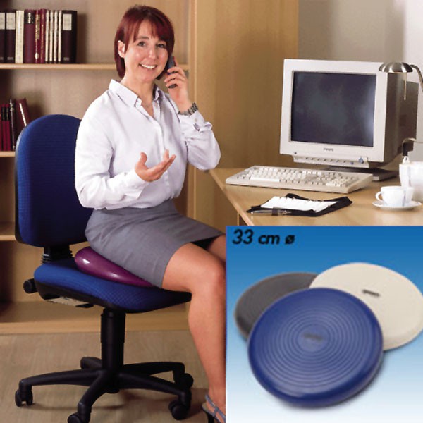 Durch regelmäßiges, aufrechtes und dynamisches Sitzen auf dem luftgefüllten Mobilkissen (33 cm) wird bei Erwachsenen und Kindern die Rückenmuskulatur gestärkt. Gerade bei längerem Arbeiten am Schreibtisch dämpft das Mobilkissen die Belastung der Bandscheiben. Richtiges Anwenden des Mobilkissens fördert außerdem die korrekte Körperhaltung und entlastet den Rücken. Weiterhin fördert es das Gleichgewicht und stärkt die Beckenboden-, Bein- und Fußmuskulatur. Zusätzlich erhält man Übungsvorschläge mit dem Mobilkissen zur Stärkung der Rücken-, Bauch-, Gesäß- und Schultermuskulatur sowie zur Förderung der Balance und Koordination. Das Mobilkissen hat einen Durchmesser von 33 cm. Es besteht aus 100 % PVC und kann mit einer handelsüblichen Fußballnadel luftreguliert werden. Zur Reinigung genügt ein weicher Lappen und lauwarmes Wasser. Bitte keine scharfen Reinigungsmittel benutzen. Technische Daten: Durchmesser: 33 cm Belastbarkeit: bis 300 kg Material: 100% PVC