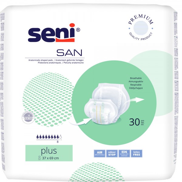Die Seni San Inkontinenzeinlagen eignen sich für mittlere Blasenschwäche.Mit dem offenen System und den hüftumfassenden Seitenflügeln bieten sie volle Bewegungsfreiheit und dennoch zuverlässigen Schutz ohne Auslaufen.Auch für Stuhlinkontinenz geeignetIdeale Anpassung an den KörperSicherheit dank dem seitlichen AuslaufschutzMinimierung unangenehmer GerücheGesunde Haut dank der atmungsaktiven AußenschichtSaugfähigkeit:8 9 TropfenLieferumfang:1×30 Stück Seni San Plus Inkontinenzeinlagen